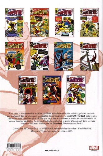 Il vit dans la nuit éternelle, mais les ténèbres abondent en bruits, odeurs, goûts et textures que la plupart des hommes sont incapables de percevoir. Si l'avocat Matt Murdock est aveugle, ses autres sens sont bien plus affûtés que ceux des autres êtres humains et son sens radar lui signale tous les obstacles. Il a donc décidé de combattre le crime chaque nuit dans les rues de New York sous le costume de Dardevil, l'Homme sans Peur ! Ce volume de DAREDEVIL : L'INTEGRALE rassemble les épisodes 1 à 11 de la série Daredevil (1964), tous parus en 1964 et 1965.