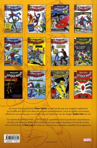 Au cours d'une expérience, Peter Parker se fait mordre par une araignée radioactive qui modifie son ADN et le dote de pouvoirs extraordinaires : force et agilité surhumaines, adhérence aux parois, plus un sixième sens qui l'alerte en cas de danger. Spider-Man est né ! Ce volume de SPIDER-MAN : L'INTEGRALE rassemble toute la production arachnéenne de 1965, soit Amazing Spider-Man (1963) 20 à 31 ainsi que le deuxième Annual de la série. Une introduction de Stan Lee et toutes les couvertures originales complètent le programme. A partir de l'épisode de mai 1965, Steve Ditko est noté comme coscénariste aux côtés de Stan Lee. Dans cette troisième intégrale consacrée à la série Amazing Spider-Man, retrouvez les premières apparitions du Scorpion et du Scarabée. Le Bouffon Vert fait également son grand retour.