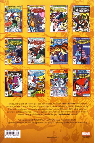 Timide, introverti et rejeté par ses camarades, le jeune Peter Parker se consacre tout entier à la science. Un jour, il prend part à une expérience qui bouleverse sa vie. Il se fait mordre par une araignée radioactive qui modifie son ADN et le dote de pouvoirs extraordinaires : force et agilité surhumaines, adhérence aux parois et un sixième sens qui l'alerte en cas de danger. Spider-Man est né ! Ce volume de Spider-Man : l'intégrale rassemble toute la production de 1981, soit les épisodes 212 à 223 d'Amazing Spider-Man et l'Annual 15.