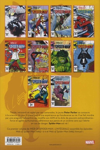 Timide, introverti et rejeté par ses camarades, le jeune Peter Parker se consacre à la science. Un jour, il prend part à une expérience qui bouleverse sa vie. Il se fait mordre par une araignée radioactive qui modifie son ADN et le dote de pouvoirs extraordinaires : force et agilité surhumaines, adhérence aux parois et un sixième sens qui l'alerte en cas de danger. Spider-Man est né ! Ce premier volume de Web of Spider-Man : L'intégrale rassemble les épisodes Web of Spider-Man (1985) 1 à 9 et Web of Spider-Man (1985) Annual 1.