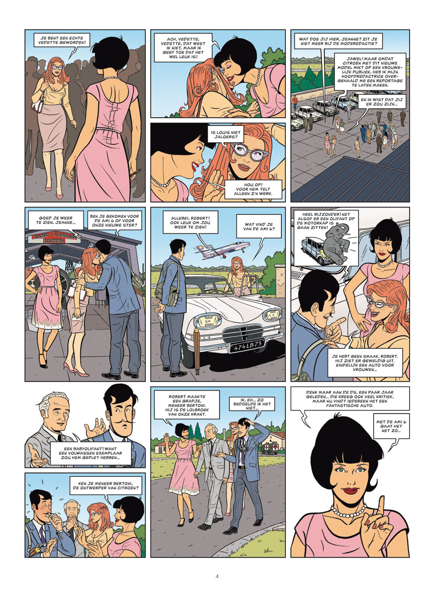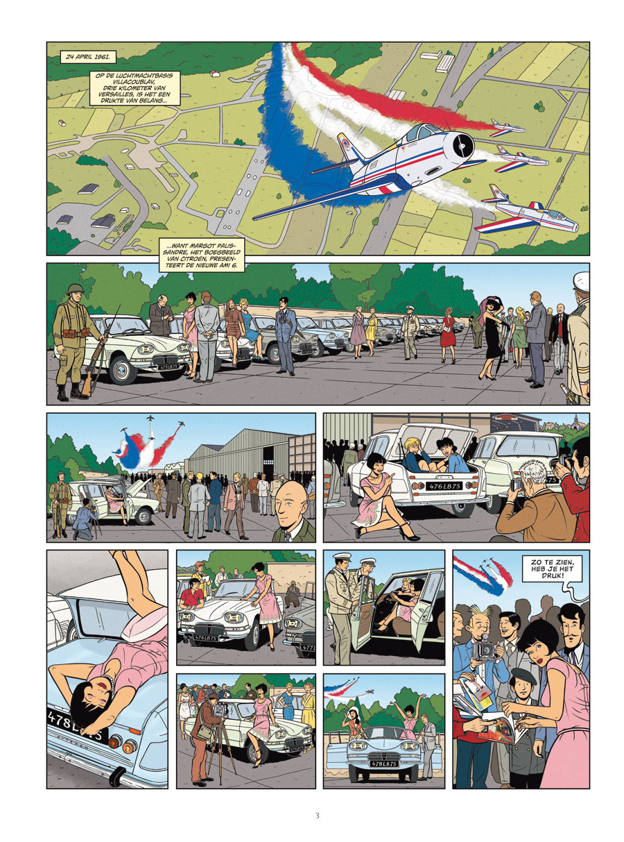 Van deze reeks bestaat ook een promopakket met de eerste drie delen hardcover = De Autoreportages van Margot PROMOPAKKET Striptekenaar Emilio van der Zuiden ( België, °1968) kennen we van volgende stripreeksen die hij tekende of aan meewerkte = Agatha Christie De Engelen van Auschwitz De Meiden van Oom Bob Mac Queen Stripscenarist Olivier Marin (Frankrijk, °1970) schreef ook al De Avonturen van Betsy Rosewood Margot is journaliste en schrijft gepassioneerd over auto’s. Tijdens haar avonturen komt ze vele legendarische modellen van de Franse auto tegen, waaronder de drie belangrijkste modellen van ontwerper Flaminio Bertoni: de Traction Avant, de DS, de 2CV. April 1961. Na haar overwinning van de 'Coupe des Demoiselles', wordt Margot het boegbeeld van Citroën. Ze schittert op alle Autosalons en presenteert met name de nieuwe Ami 6. De beroemde couturier Théophile Saint-Cardon verbindt zich aan het merk Citroën en kleedt een speciaal model van de 2CV aan in de kleuren van zijn nieuwe collectie. Maar diverse aanslagen verhinderen de presentatie aan het publiek van het model waar reikhalzend naar wordt uitgekeken: de “2CV Margot”, waarvan slechts 22 exemplaren worden geproduceerd ... Wie is verantwoordelijk voor die aanslagen? En wat is de reden? Gretiger dan ooit, stort Margot zich in het onderzoek! Dit boek vormt de afsluiter van de Flaminio Bertoni-reeks.