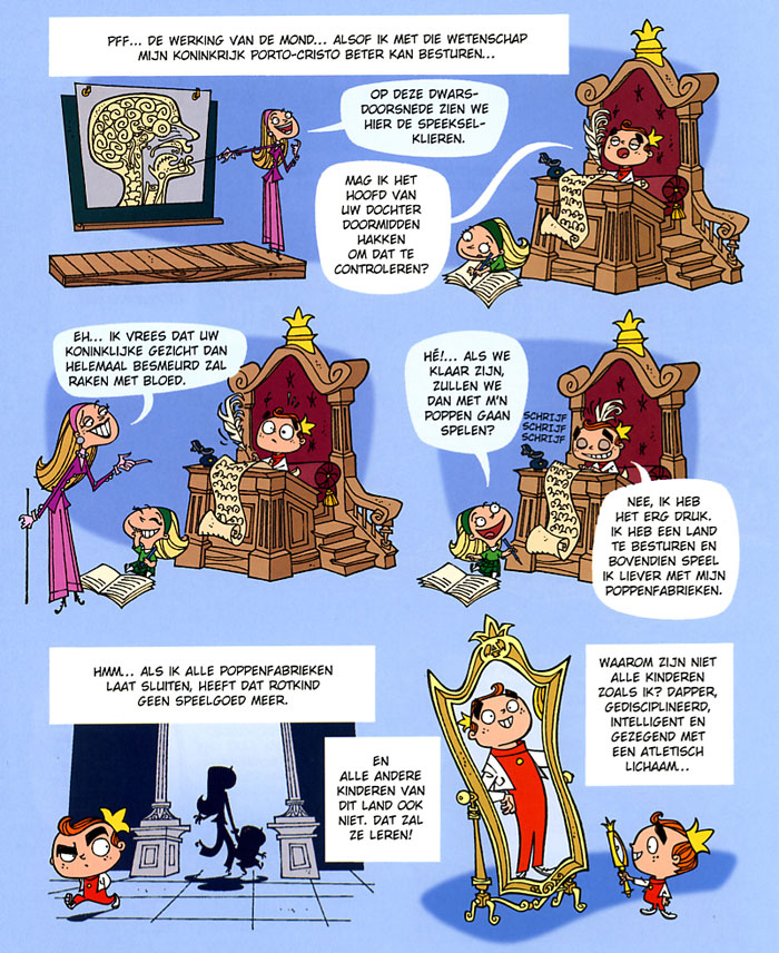 Hij is een kind, maar dat wil niet zeggen dat hij niet de kuren van een koning mag hebben. Hij is ook een koning die zichzelf de kuren van een kind permitteert. Het is niet eenvoudig. Aan de ministersvergaderingen komt nooit een einde. En buiten is het mooi weer en er zijn nog duizend andere, heel belangrijke dingen te doen (waterbommen gooien, valstrikken leggen voor de tuinman en kikkers in de bedden van de dienstmeisjes leggen, om maar wat te noemen). Gelukkig geniet koning Adalbert, voor sommigen ook wel koning Snotneus, absoluut gezag onder zijn onderdanen. Dus als hij even van zijn stoel wil om de grenzen van zijn kunnen te verkennen, mag dat best.