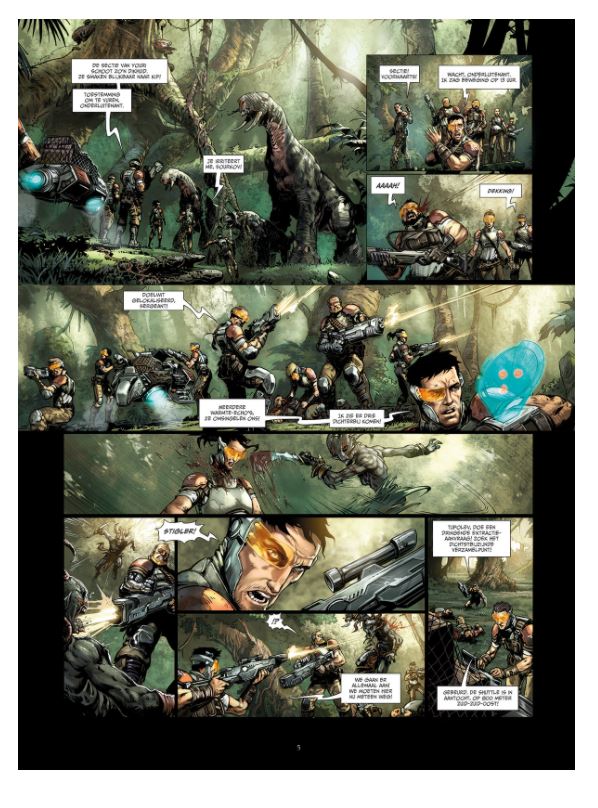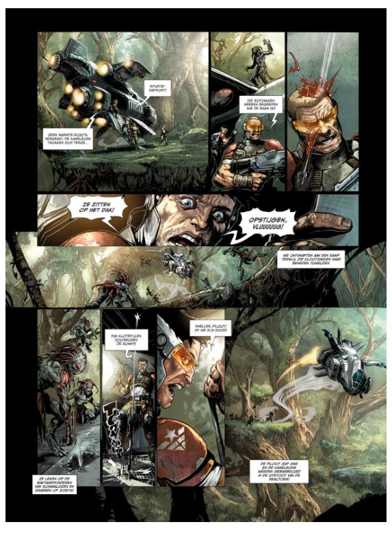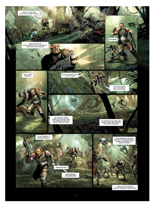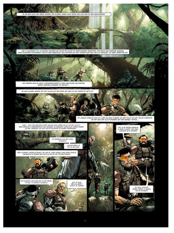 Gemiddelde score 5 / 5Goooooooood morning Adonaï! De aarde is om zeep. Het laatste restje mensen verzamelde zich per continent in vijf grote armada’s en trok het heelal in. Elke ruimtevloot trok naar een exoplaneet die al bevolkt is door een of meerdere intelligente levensvormen. Dit betekent maar één ding: er is leven mogelijk voor de mens. De anderen moeten gewoon maar wat opschuiven. De Russen weken met hun ruimtevloot uit naar de planeet Adonaï. Ondanks de veelbelovende naam is het er de hel. De hele planeet is overwoekerd door een gigantisch oerwoud dat zich niet laat temmen. Gerooide stukken herstellen zich volledig in amper een paar maanden. In die jungle wonen de Adoniërs. Het zijn vriendelijke aliens die de aangemeerde Russen laten sukkelen. Maar een deel onder hen, de Kameleons, wil de Russen direct weg en vermoorden hen in een vuile guerillaoorlog. Het vervelende is dat de Kameleons niet te onderscheiden zijn van de Adoniërs. Het aangemeerde kolonisatieleger heeft het dus niet onder de markt in een uitzichtloze oorlog. Boven hen zweven de andere ruimteschepen in een baan rond de planeet, ongeduldig wachtend tot hun nieuwe thuis veilig genoeg is. De conceptreeks Conquest is een goede serie. Het uitgangspunt is kristalhelder en biedt ruimte genoeg om steeds een verrassend verhaal te vertellen. De initiële cyclus van vijf exoplaneten was meer dan uitstekend. Vijf nieuwe planeten en strips worden nu aan de reeks verbonden. De eerste nieuwe is Adonaï. Je moet al van een andere planeet komen om niet de parallellen te zien met de Vietnamoorlog. Gelukkig verweven de scenaristen Jean-Luc Istin en Nicolas Jarry er ook nog wat Russische humor en misgroeid communistisch gedrag in. Het maakt van deze Adonaï een al bij al aardige kolonisatiestrip. Tot onze verbazing kreeg dit album op een Franstalige stripforum de hoogste lezerswaardering van alle delen. Zo gek krijgen ze ons niet — het vorige deel, Enorus, was bijvoorbeeld wel helemaal ons ding. Daarvoor zijn de tekeningen van Bertrand Benoît (Dwergen, Brocéliande, Elfen, Orks & Goblins) net iets te comicgeïnspireerd. De spieren van de macho’s zijn ons te opgepompt en de rest van de lucht ging iets te veel in de boezems van de dames. Smaken, hé. Gelukkig maakte Kyko Duarte het storyboard en verzorgde Olivier Héban ook voor dit deel de inkleuring, waardoor de eenheid binnen de reeks bewaard is gebleven. Adonaï is dus het beste deeltje uit de reeks volgens de vele lezers van een Frans forum. Voor ons is deze kolonisatie net niet origineel genoeg. Over één ding zijn we het wel unaniem eens: Conquest blijft een reeks om te volgen. WOUTER PORTEMAN (ssz)
