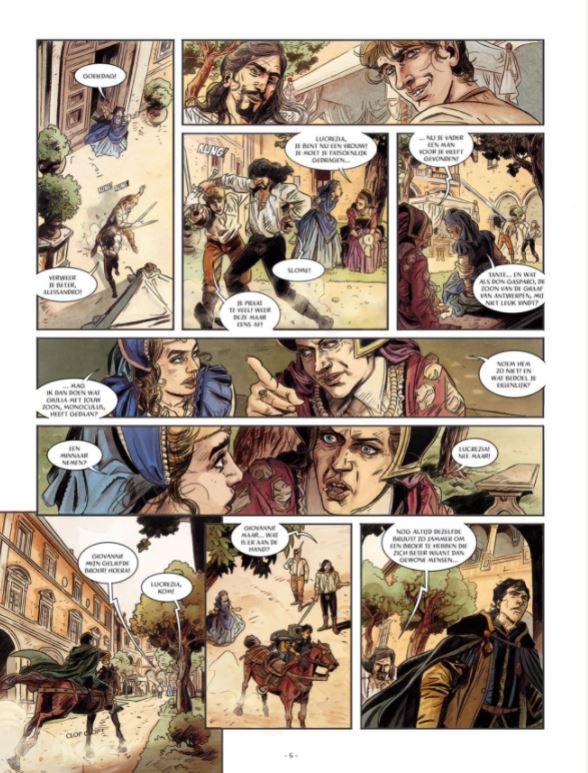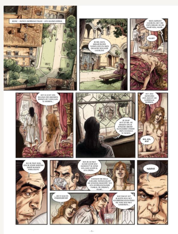 Stripscenariste Mogavino Simona is een Italiaanse (°1974 ) en werkte vroeger voor Paganini & Imbro een prestigieus erkende onderneming in het restaureren van kunstwerken. ze komt via uitgeefster arya Snirnoff in contact met Delalande en Gomez en krijgt de kans met hen een verhaalreeks in Bloed koninginnen te schrijven. Namelijk Eleonora. deze twee stripreeksen kennen we bij ons van haar hand: Ridder Eon Eleonora Striptekenaar Lapo Alessio, ook Italiaan ( °1974 ) tekende ook volgende reeksen in het Nederlands Ridder Eon De Heren van Cornwall Agency Interpol Pausen zijn veel meer dan priesters van Rome, het zijn krijgsheren, diplomaten... of in het geval van Alexander VI: machtswellustelingen met een (on)gezond libido. Met haar scenario geeft Simona Mogavino (Bloedkoninginnen – Eleonora en Catharina De’ Medici) een ongelooflijke inkijk in het turbulente leven van Rodrigo Borgia, beter bekend als paus Alexander VI. Het resultaat is een fraai tijdsdocument verlevendigd door de tekeningen van Alessio Lapo. Bovendien vind je achteraan het album een dossier met nog wat meer historische context Rome, 26 augustus 1492. Rodrigo Borgia, neef en adoptiefzoon van paus Calixtus III, neemt plaats op de pauselijke troon! Dankzij corruptie en politiek gemanoeuvreer in de Romeinse curie verslaat hij zijn grote rivaal, Giuliano delle Rovere, de latere Julius II, en wordt de 214e bisschop van Rome, paus van de katholieke Kerk. Terwijl hij geniet van zijn moment, grommelt het volk… Alexander VI regeert elf jaar lang zonder scrupules. Elf jaar vol schandalen en manipulatie, gesjacher en chantage en hij draait zijn hand ook niet om voor moord en vergiftiging,als het moet. Hij misbruikt zijn macht om zijn eigen familie voor te trekken en een enorme rijkdom te vergaren. Alexander VI heeft niet minder dan zes erkende kinderen, en vast nog wat meer met zijn drie à vier verschillende maîtresses. Deze paus met zijn duivelse reputatie heeft vier passies: familie, vrouwen, luxe en macht!