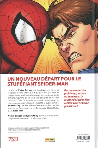 Retour aux sources ! Peter Parker est de nouveau en couple avec Mary Jane ! Il a aussi un nouveau colocataire, un nouvel ennemi et un nouveau boulot ! Mais une expérience scientifique va tout bouleverser... Après dix ans de bons et loyaux services, Dan Slott passe les rênes de Amazing Spider-Man au talentueux Nick Spencer (Doctor Strange : Damnation, Ant-Man, Secret Empire). Au dessin, on découvre Ryan Ottley qui vient d'achever sa très longue prestation sur Invincible.