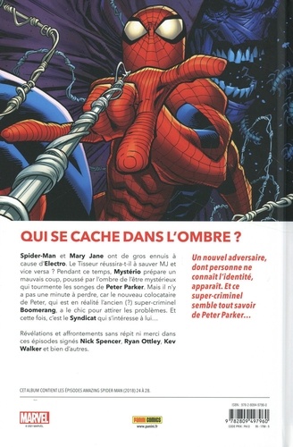 Spider-Man et Mary Jane ont de gros ennuis à cause d'Electro. Le Tisseur réussira-t-il à sauver MJ et vice versa ? Pendant ce temps, Mystério prépare un mauvais coup, poussé par l'ombre de l'être mystérieux qui tourmente les songes de Peter Parker. Mais il n'y a pas une minute à perdre, car le nouveau colocataire de Peter, qui est en réalité l'ancien (? ) super-criminel Boomerang, a le chic pour attirer les problèmes. Et cette fois, c'est le Syndicat qui s'intéresse à lui... Un nouvel adversaire, dont personne ne connaît l'identité, apparaît. Et ce super-criminel semble tout savoir de Peter Parker... Révélations et affrontements sans répit ni merci dans ces épisodes signés Nick Spencer, Ryan Ottley, Kev Walker et bien d'autres.