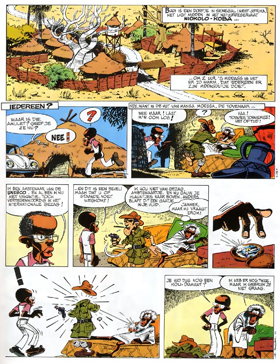 Robbedoes en Kwabbernoot krijgen de opdracht een amulet terug te bezorgen aan een Afrikaanse tovenaar. Robbedoes ziet er misschien nog steeds uit als de keurige piccolo in rood uniform die hij ooit was, maar zijn leven is nu wel heel wat avontuurlijker dan dat van een hotelhulpje. Samen met zijn onafscheidelijke vriend Kwabbernoot en Spip, de grappige eekhoorn, vecht Robbedoes overal ter wereld tegen misdadigers. En zijn tegenstanders zijn niet min: zo moet hij het opnemen tegen de verschrikkelijke geleerde Zorglub of de boosaardige piraat John Helena, tegen de Italiaanse maffia en Chinese gangsterbendes in New York of gaat hij in Palombië het geheim van een raadselachtig dier ontsluieren: de Marsupilami.