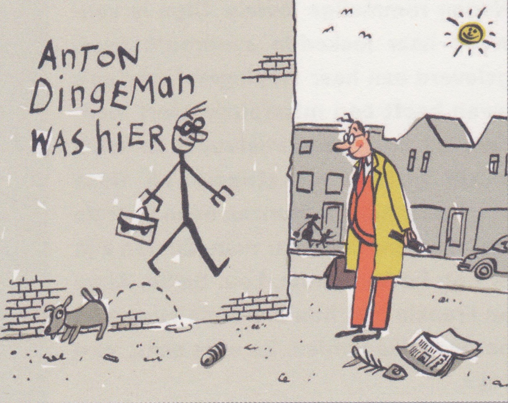 Eenentwintig (21) jaar lang was Brave Burger Anton Dingeman zes (6) dagen per week in dagblad Trouw getuige van de actualiteit, die hij altijd even vriendelijk bescheiden wist te relativeren. Voor menigeen was hij een baken van rust in het nieuwsgeweld van de dag. En nu is hij dit voorjaar met pensioen gegaan. Niet alleen zijn trouwe schare lezers in zijn eigen dagblad waren in shock, ook columnisten van collega-dagbladen zoals de Volkskrant. Sylvia Wittman riep in vertwijfeling op Twitter: 'Waarom?!' Margriet Oostveen vroeg direct belet bij zijn schepper Pieter Geenen en moppert: 'Ophouden kan natuurlijk volstrekt niet.' Maar hij doet het toch. Sterker nog, de nuchtere Anton Dingeman, die alleen maar soms héél even zijn zelf beheersing verloor, zit inmiddels in Italië. Als doekje voor het bloeden heeft Pieter Geenen in Anton Dingeman was hier Dingemans beste inzichten gebundeld, gelardeerd met Weetjes van de Week. Voor iedereen die Anton Dingeman, net als wij, nu al mist. Maar ook voor al die anderen die de afgelopen 21 jaar alle inzichten van Dingeman hebben moeten missen, omdat ze per ongeluk op een andere krant waren geabonneerd. Anton Dingeman heeft zijn sporen achtergelaten, Anton Dingeman was hier.