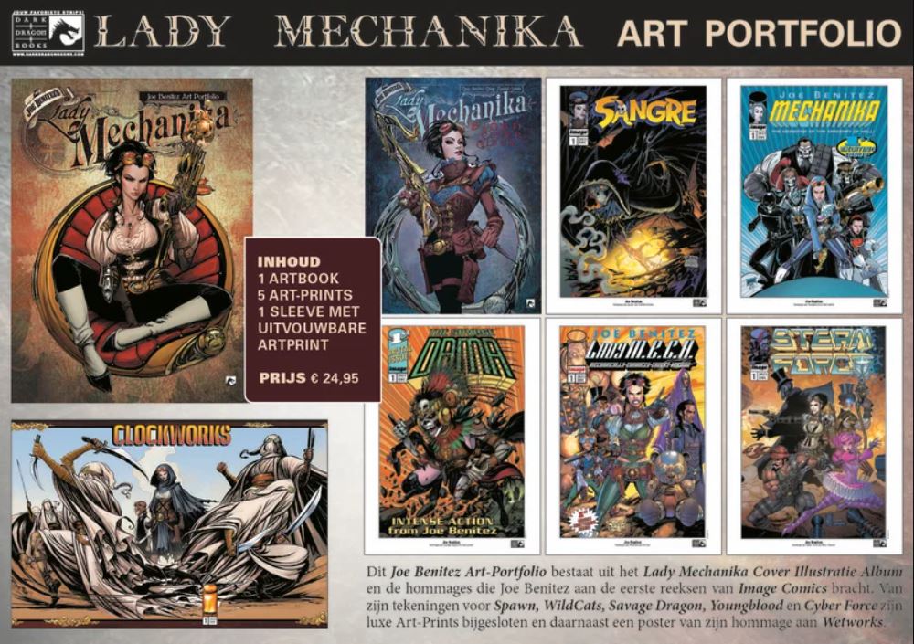 Verwacht mei Dit Joe Benitez Art-Portfolio bestaat uit het Lady Mechanika Cover Illustratie Album en de hommages die Joe Benitez aan de eerste reeksen van Image Comics bracht. Van zijn tekeningen voor Spawn, WildCats, Savage Dragon, Youngblood en Cyber Force zijn luxe Art-Prints bijgesloten en daarnaast een poster van zijn hommage aan Wetworks. INHOUD: - 1 artbook - 5 art-prints - 1 sleeve met uitvouwbare artprint