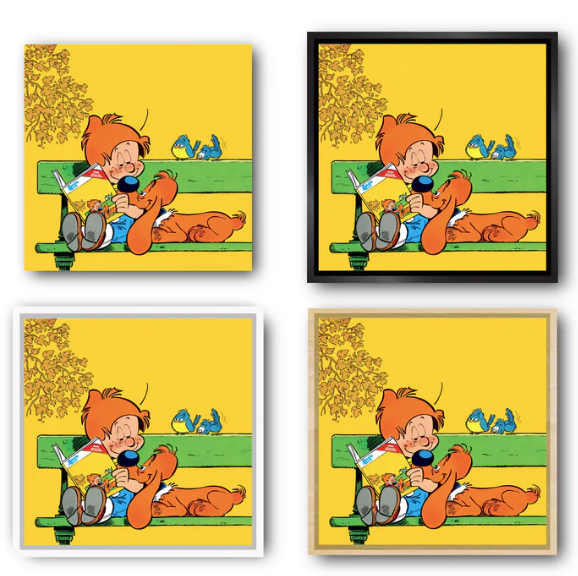 Onze Amerikaanse baklijsten in "L"-profiel worden met de hand in Frankrijk gemaakt van massief hout. Deze frames bieden een elegante esthetiek zonder af te leiden van het kunstwerk. Ze zijn verkrijgbaar in verschillende afwerkingen om te passen bij de sfeer van stripverhalen.