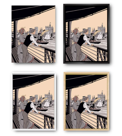 Onze Amerikaanse baklijsten in "L"-profiel worden met de hand in Frankrijk gemaakt van massief hout. Deze frames bieden een elegante esthetiek zonder af te leiden van het kunstwerk. Ze zijn verkrijgbaar in verschillende afwerkingen om te passen bij de sfeer van stripverhalen.