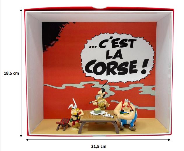 PRE ORDER PRE ORDER beschikbaarheid: voorzien oktober 2023 Gelimiteerd op 350 ex deze doos bevat - 4 personages in metaal, handgeschilderd - 6 decorstukken in metaal, handgeschilderd geïnspireerd op het album 'Asterix in Corsica'
