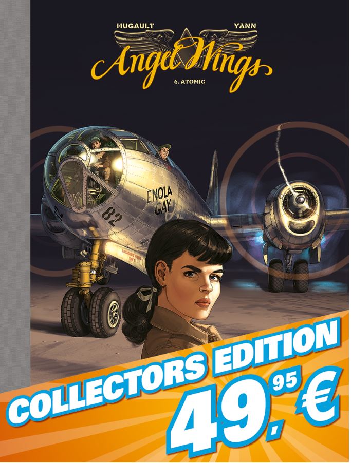 Slot van deze tweede Cyclus Verzamelaars en liefhebbers van het werk van Romain Hugault willen deze Luxe Collectors Edition absoluut niet missen! Verschijnt woensdag 11 december - Luxe hardcover 'Angel Wings' deel 6 met speciale covertekening - Linnen rug - 1 Prachtige display van vliegtuigen - 2 A3 kunstdrukken (reguliere + limited versie) - 1 door Romain Hugault gesigneerde A4 ex-libris - oplage slechts 100 exemplaren, OP=OP! Angela is eindelijk gearriveerd op Tinian Island, de enorme 'Coral Plane Carrier' die dienst doet als platform voor duizend B-29 Flying Superforts die dagelijks vliegen om Japanse steden te verpletteren onder een meedogenloos tapijt van bommen. ... Ze ontmoet Taaroa, haar Hawaiiaanse teamgenoot, die nu aan boord van een Lockeed Ventura vliegt. Voortgaand op haar onderzoek naar de oorzaken van de dood van haar zuster Maureen, slaagt onze heldin erin om Dora Dougherty, de teamgenoot van haar zuster, te ontmoeten en haar te ondervragen over de omstandigheden van het vreemde ongeval dat haar heeft gedood. Angel Wings is een Tweede Wereldoorlog-avontuur van topduo Yann en Romain Hugault (De Nachtuil, Edelweiss).