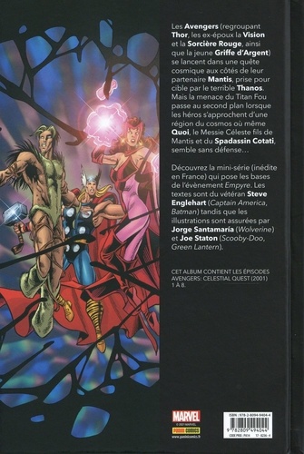 Les Avengers (regroupant Thor, les ex-époux la Vision et la Sorcière Rouge, ainsi que la jeune Griffe d'Argent) se lancent dans une quête cosmique aux côtés de leur partenaire Mantis, prise pour cible par le terrible Thanos. Mais la menace du Titan Fou passe au second plan lorsque les héros s'approchent d'une région du cosmos où même Quoi, le Messie Céleste fils de Mantis et du Spadassin Cotati, semble sans défense... Découvrez la mini-série (inédite en France) qui pose les bases de l'évènement Empyre. Les textes sont du vétéran Steve Englehart (Captain America, Batman)tandis que les illustrations sont assurées par Jorge Santamaría (Wolverine) et Joe Staton (Scooby-Doo, Green Lantern).