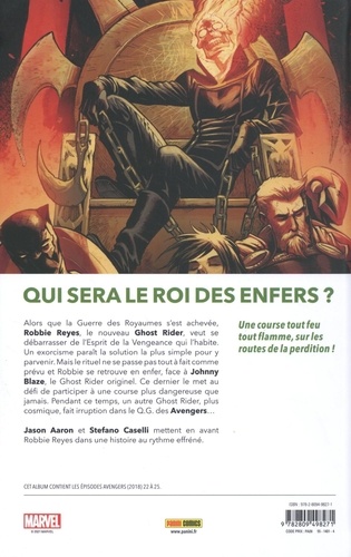 Alors que la Guerre des Royaumes s'est achevée, Robbie Reyes, le nouveau Ghost Rider, veut se débarrasser de l'Esprit de la Vengeance qui l'habite. Un exorcisme paraît la solution la plus simple pour y parvenir. Mais le rituel ne se passe pas tout à fait comme prévu et Robbie se retrouve en enfer, face à Johnny Blaze, le Ghost Rider originel. Ce dernier le met au défi de participer à une course plus dangereuse que jamais. Pendant ce temps, un autre Ghost Rider, plus cosmique, fait irruption dans le Q.G. des Avengers... Une course tout feu tout flamme, sur les routes de la perdition ! Jason Aaron et Stefano Caselli mettent en avant Robbie Reyes dans une histoire au rythme effréné.