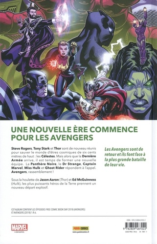 Steve Rogers, Tony Stark et Thor sont de nouveau réunis pour sauver le monde d'êtres cosmiques de six cents mètres de haut : les Célestes. Mais alors que la Dernière Armée arrive, il est temps de former une nouvelle équipe. La Panthère Noire, le Dr Strange, Captain Marvel, Miss Hulk et Ghost Rider répondent à l'appel. Avengers, rassemblement ! Les Avengers sont de retour et ils font face à la plus grande bataille de leur vie. Sous la houlette de Jason Aaron (Thor) et Ed McGuinness (Hulk), les plus puissants héros de la Terre prennent un nouveau départ explosif.