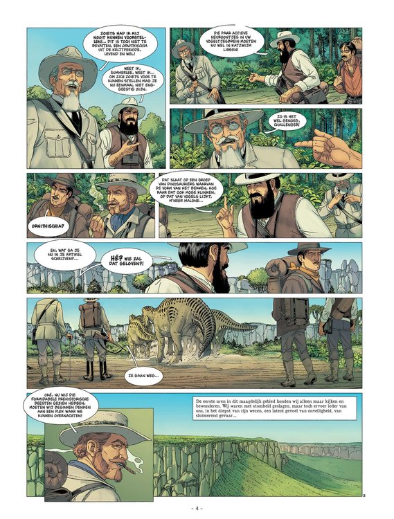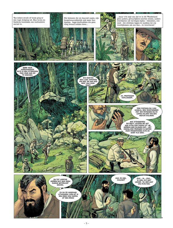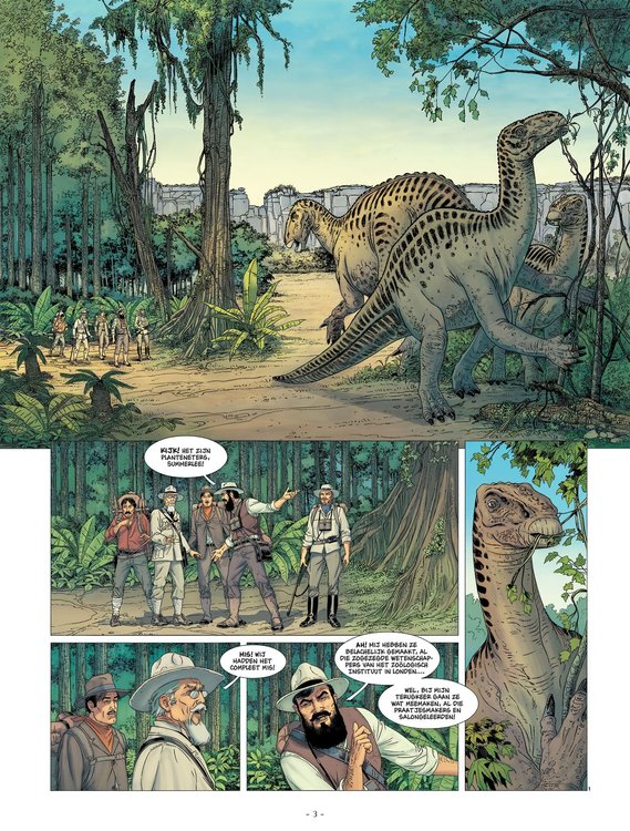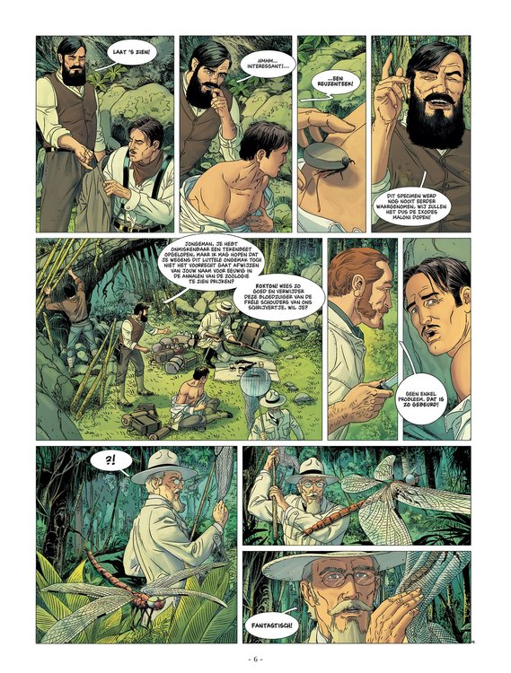De eerste uren in dit maagdelijke gebied konden wij alleen maar kijken en bewonderen. Wij waren met stomheid geslagen, maar ieder van ons ervaarde, in het diepst van zijn wezen, een latent gevoel van onveiligheid, van sluimerend gevaar ... Van iedere boom of struik ging er een dreiging uit. Hun bladeren, hun kruin boezemt ons een instinctieve angst in. Dit is het uur waarop in Londen de avond valt. Een paarse mist hangt over de Theems, de mensen beëindigen hun dagtaak, zetten zich op weg, keuvelend over koetjes en kalfjes, leiden hun beschermde, veilige leventje ... en daar zijn wij, op weg naar het onbekende. Wij trokken een pad door het hoge gras dat nog nooit eerder door een mens betreden was. Nieuw drieluik waarin Bec het legendarische avontuur van Arthur Conan Doyle, 'The lost world', adapteert in stripvorm!