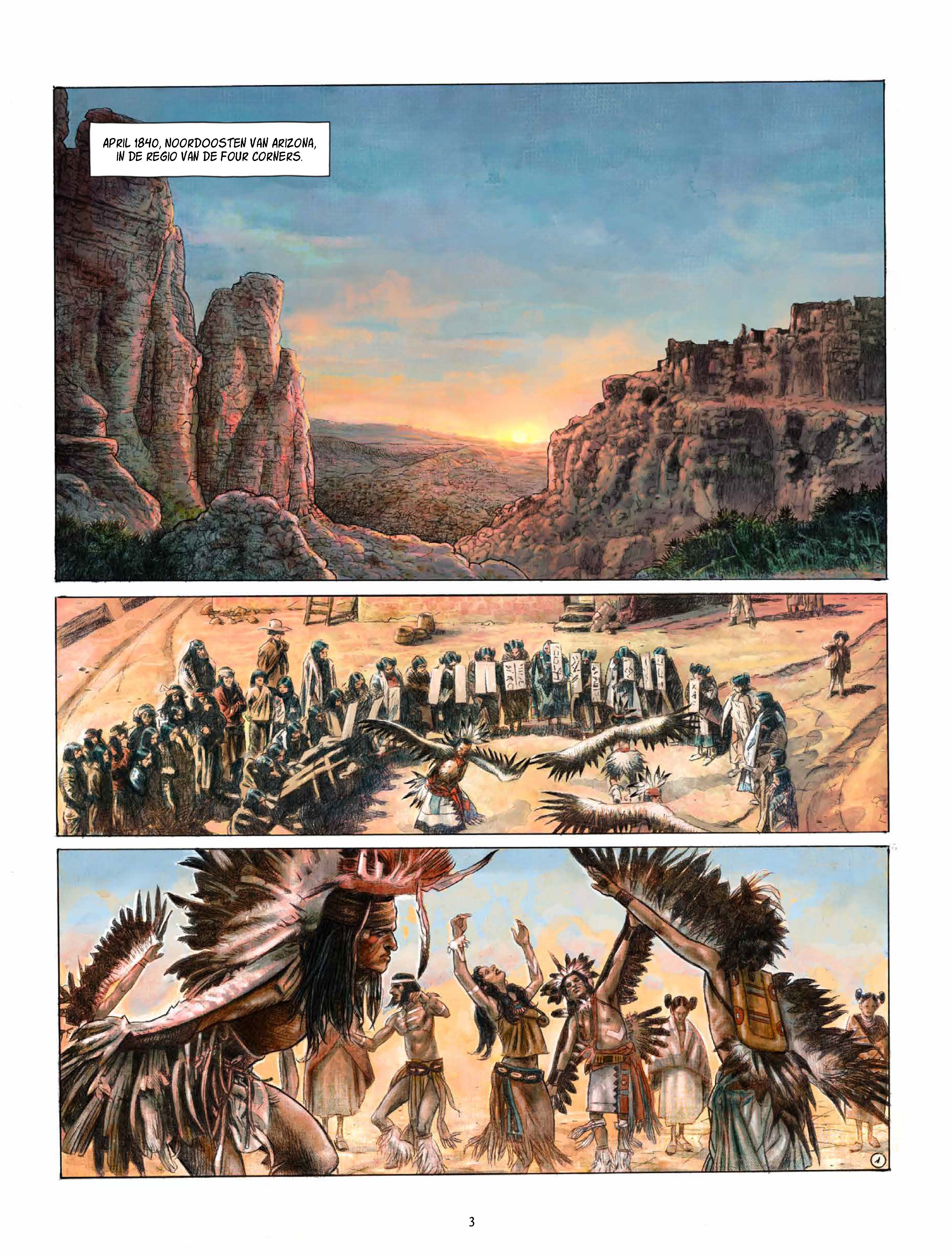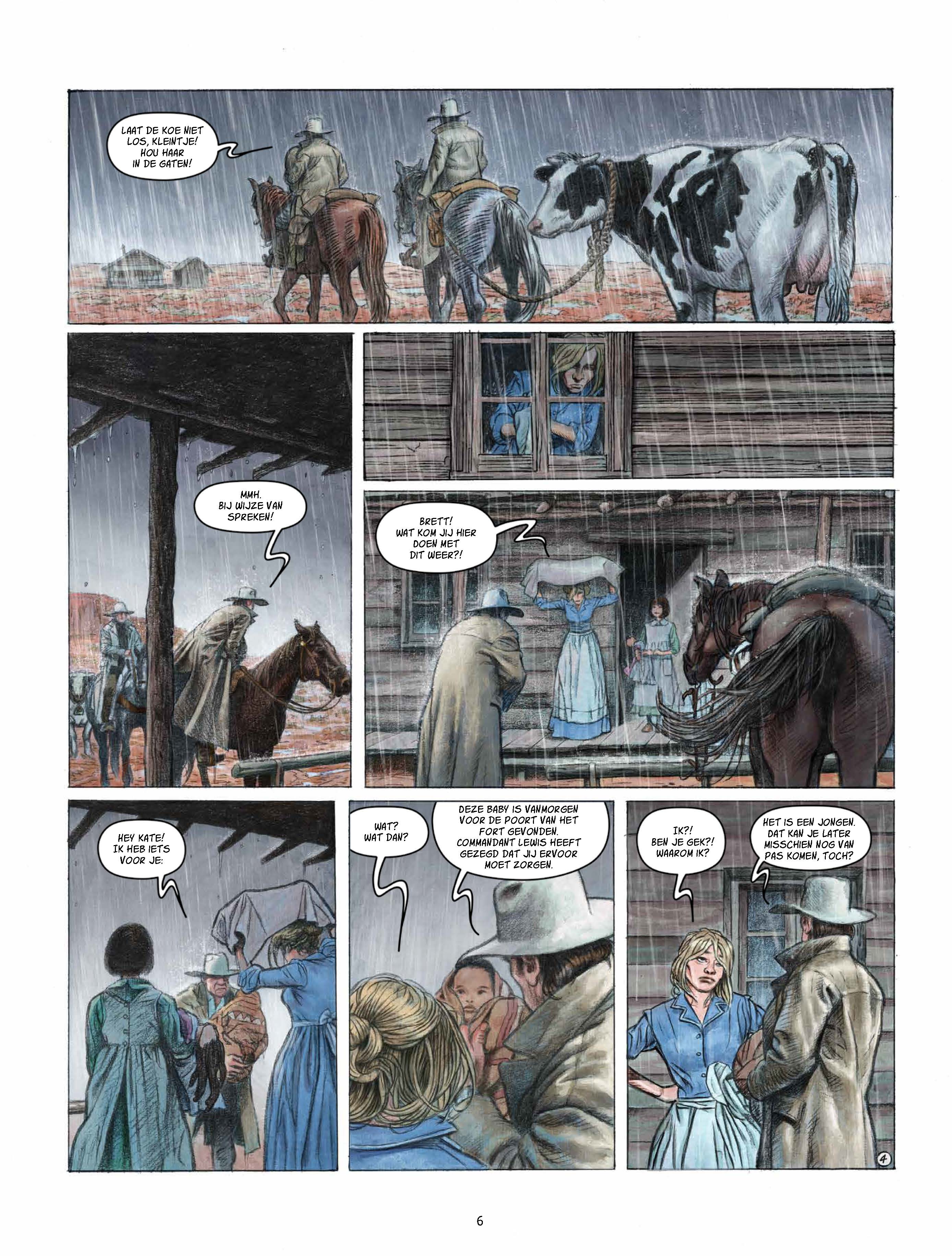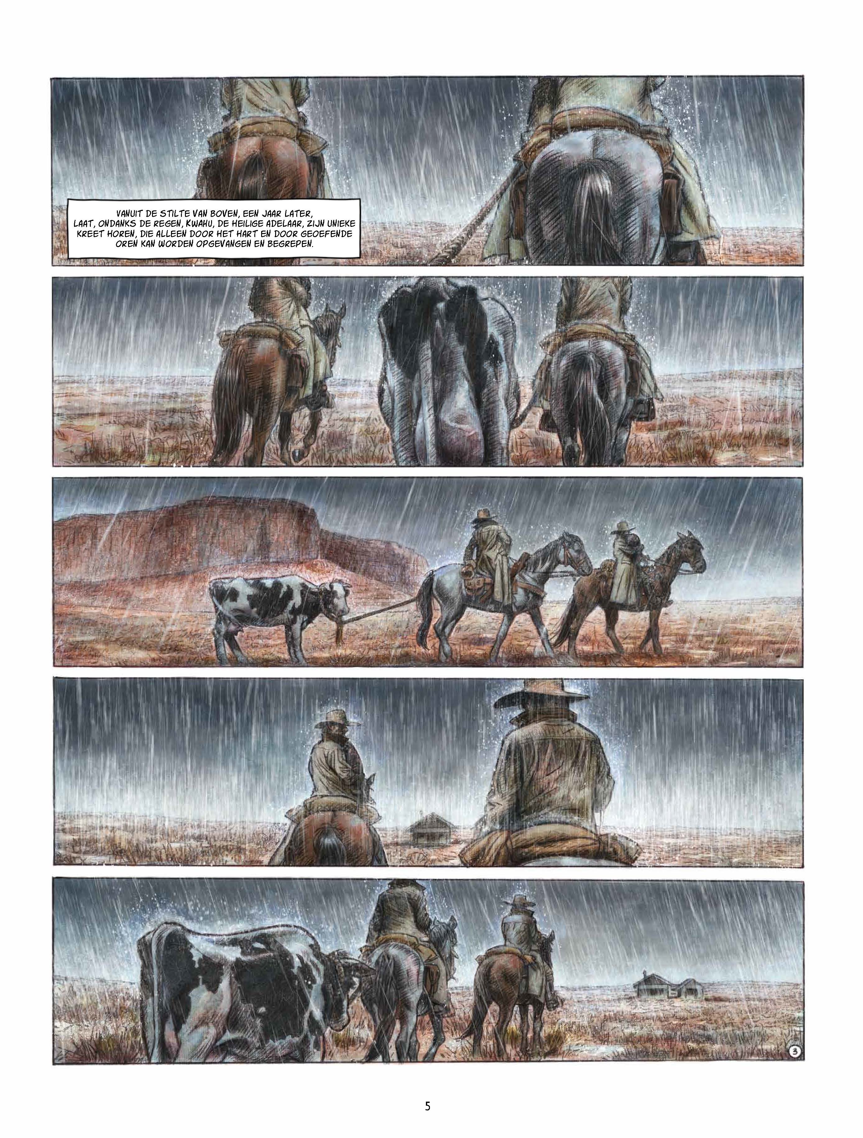 Een mystieke western over schuld, wraak en verlossing. Geïnspireerd door de passie van zijn tekenaar voor het westerngenre, voegt Makyo er een diepere, haast spirituele dimensie aan toe, met verwijzingen naar oeroude mythen en het eeuwige gevecht tussen goed en kwaad. Twee broers komen lijnrecht tegenover elkaar te staan: de ene kiest voor het pad van de duisternis, de andere voor dat van het licht. Wanneer de broer van commandant Lewis wordt vermoord, laat hij zich meeslepen door wraak. In blinde razernij beveelt hij de aanval op een Hopi-dorp — midden tijdens een heilige ceremonie. Een jaar later krijgt Kate, een jonge weduwe die door armoede in de prostitutie is beland, bij de poort van het fort een indiaans baby’tje in handen gedrukt. Als het kind sterft, wacht haar de strop. In de stilte van de nacht verschijnt een groep Hopi om eer te betuigen aan het kind — met ingetogen respect. Wat volgt is een verhaal over verlossing, verbondenheid en spirituele kracht. Een western die het klassieke genre overstijgt: mystiek, aangrijpend en visueel overweldigend.