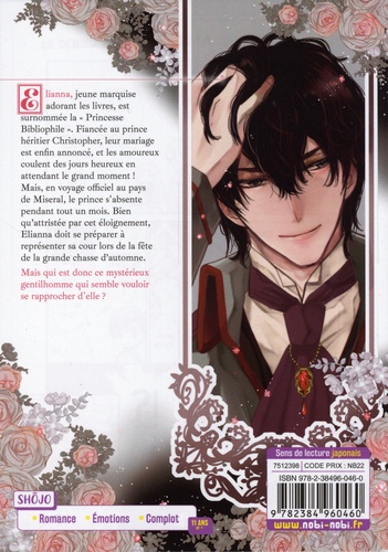 Elianna, jeune marquise adorant les livres, est surnommée la "Princesse Bibliophile" . Fiancée au prince héritier Christopher, leur mariage est enfin annoncé, et les amoureux coulent des jours heureux en attendant le grand moment ! Mais, en voyage officiel au pays de Miseral, le prince s'absente pendant tout un mois. Bien qu'attristée par cet éloignement, Elianna doit se préparer à représenter sa cour lors de la fête de la grande chasse d'automne. Mais qui est donc ce mystérieux gentilhomme qui semble vouloir se rapprocher d'elle ?
