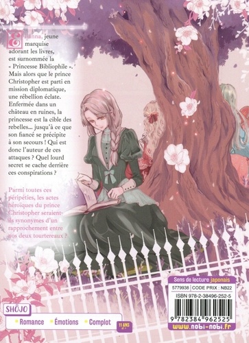 Elianna, jeune marquise adorant les livres, est surnommée la "Princesse Bibliophile". Mais alors que le prince Christopher est parti en mission diplomatique, une rébellion éclate. Enfermée dans un château en mines, la princesse est la cible des rebelles... jusqu'à ce que son fiancé se précipite à son secours ! Qui est donc l'auteur de ces attaques ? Quel lourd secret se cache derrière ces conspirations ? Parmi toutes ces péripéties, les actes héroïques du prince Christopher seraient-ils synonymes d'un rapprochement entre nos deux tourtereaux ?