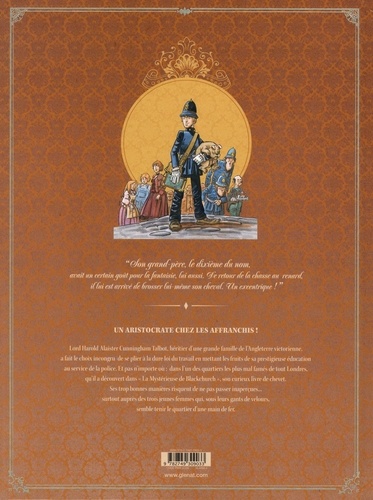 Un dandy au pays des bandits ! Lord Harold Alaister Cunningham Talbot, douzième du nom, est l'héritier de l'une des plus grandes familles de l'Angleterre victorienne. Mais alors que ses nobles ascendances lui assureraient un train de vie confortable et sans effort, ce grand amateur de littérature romanesque décide de se plier à la dure loi du travail en mettant les fruits de sa prestigieuse éducation au service de la police. Et pas n'importe où : le voilà propulsé inspecteur novice à Blackchurch, l'un des quartiers les plus mal famés de tout Londres ! En arrivant sur place, le candide Harold va découvrir un univers bigarré, peuplé d'escrocs et de fieffés forbans, où l'unique loi qui vaille est celle du silence. Ses trop bonnes manières risquent de ne pas passer inaperçues... surtout auprès des trois jeunes femmes qui semblent tenir le quartier d'une main de fer. Philippe Charlot et Xavier Fourquemin lance une nouvelle série enlevée dans la fascinante Londres de l'époque victorienne. Les chroniques policières d'un héros en décalage total avec son environnement, source de quiproquos mais surtout d'aventures !