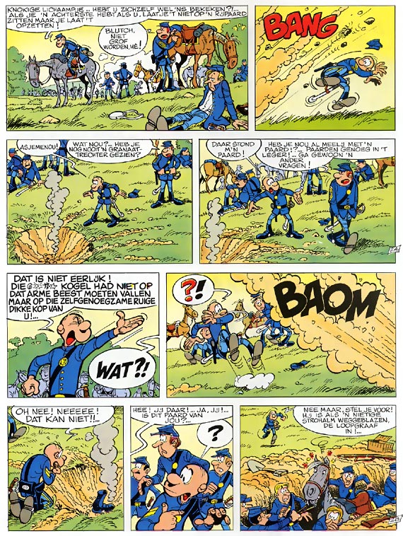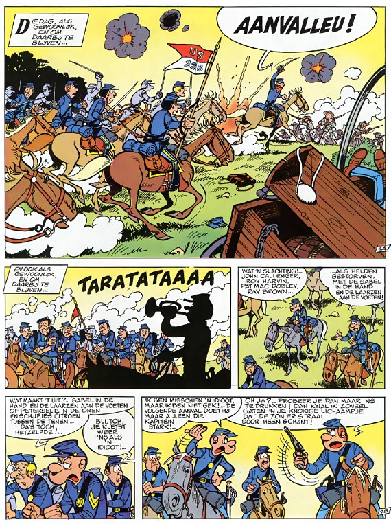 De reeks 'De Blauwbloezen' is een geslaagde mengeling van avontuur en humor. Cauvin gebruikt - zoals hij wel meer doet - historische anekdotes uit de Amerikaanse burgeroorlog om ons hilarische verhalen te vertellen over de perikelen in het leger, waar de hoogste officieren niet per se de slimste zijn... Willy Lambil heeft zich uitstekend gedocumenteerd en maakt van zijn pagina's heldere, intelligente kunstwerkjes. Het resultaat is amusement op hoog niveau, dat door een nog steeds groeiend publiek wordt gewaardeerd.