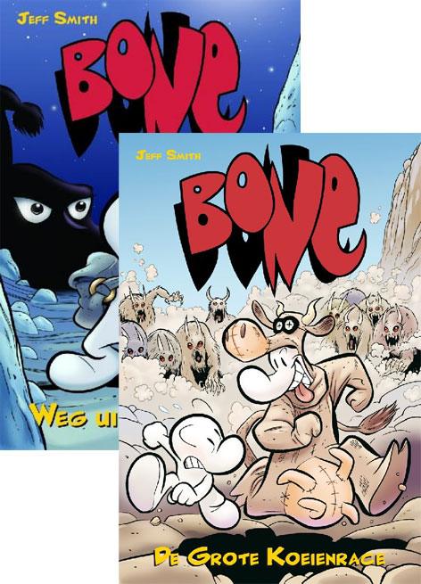 Bone is een van de grootste stripgeschiedenissen van het afgelopen decennium. Al meer dan een miljoen lezers maakten kennis met Phoney Bone, Smiley Bone en Fone Bone. De drie neven Bone worden uit hun stad Boneville verjaagd. Ze komen terecht in een vallei waar ze achterna gezeten worden door ratachtige monsters en af en toe duikt een rode draak op. Kunnen ze de weg naar huis nog wel vinden? Dit pakket bevat de eerste 2 delen: 1. Weg uit Boneville 2. De grote koeienrace
