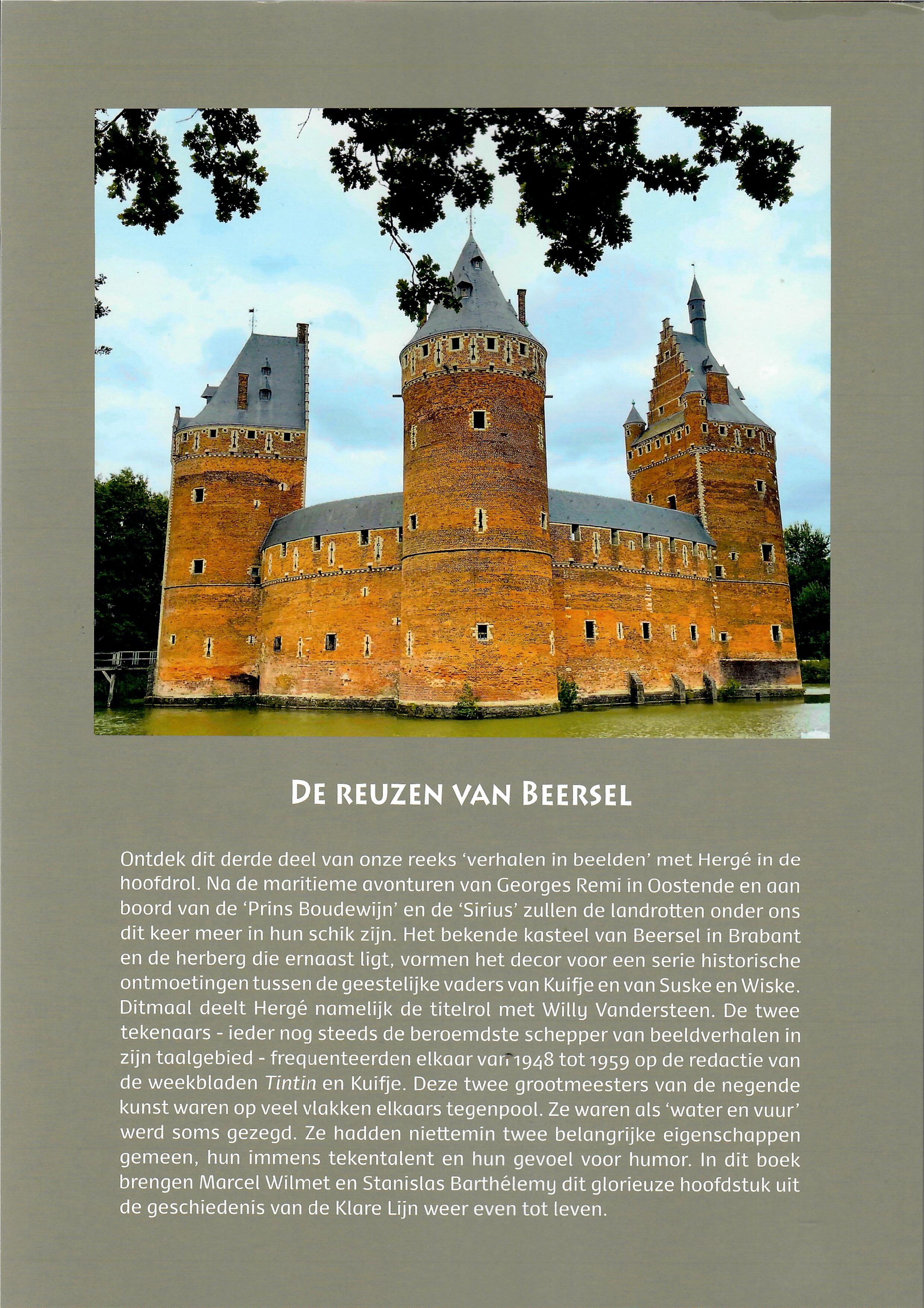 Ontdek dit derde deel van onze reeks ‘verhalen in beelden’ met Hergé in de hoofdrol. Na de maritieme avonturen van Georges Remi in Oostende en aan boord van de ‘Prins Boudewijn’ en de ‘Sirius’ zullen de landrotten onder ons dit keer meer in hun schik zijn. Het bekende kasteel van Beersel in Brabant en de herberg die ernaast ligt, vormen het decor voor een serie historische ontmoetingen tussen de geestelijke vaders van Kuifje en van Suske en Wiske. Ditmaal deelt Hergé namelijk de titelrol met Willy Vandersteen. De twee tekenaars - ieder nog steeds de beroemdste schepper van beeldverhalen in zijn taalgebied - frequenteerden elkaar van 1948 tot 1959 op de redactie van de weekbladen *Tintin* en *Kuifje*. Deze twee grootmeesters van de negende kunst waren op veel vlakken elkaars tegenpool. Ze waren als ‘water en vuur’ werd soms gezegd. Ze hadden niettemin twee belangrijke eigenschappen gemeen, hun immens tekentalent en hun gevoel voor humor. In dit boek brengen Marcel Wilmet en Stanislas Barthélémy dit glorieuze hoofdstuk uit de geschiedenis van de Klare Lijn weer even tot leven.