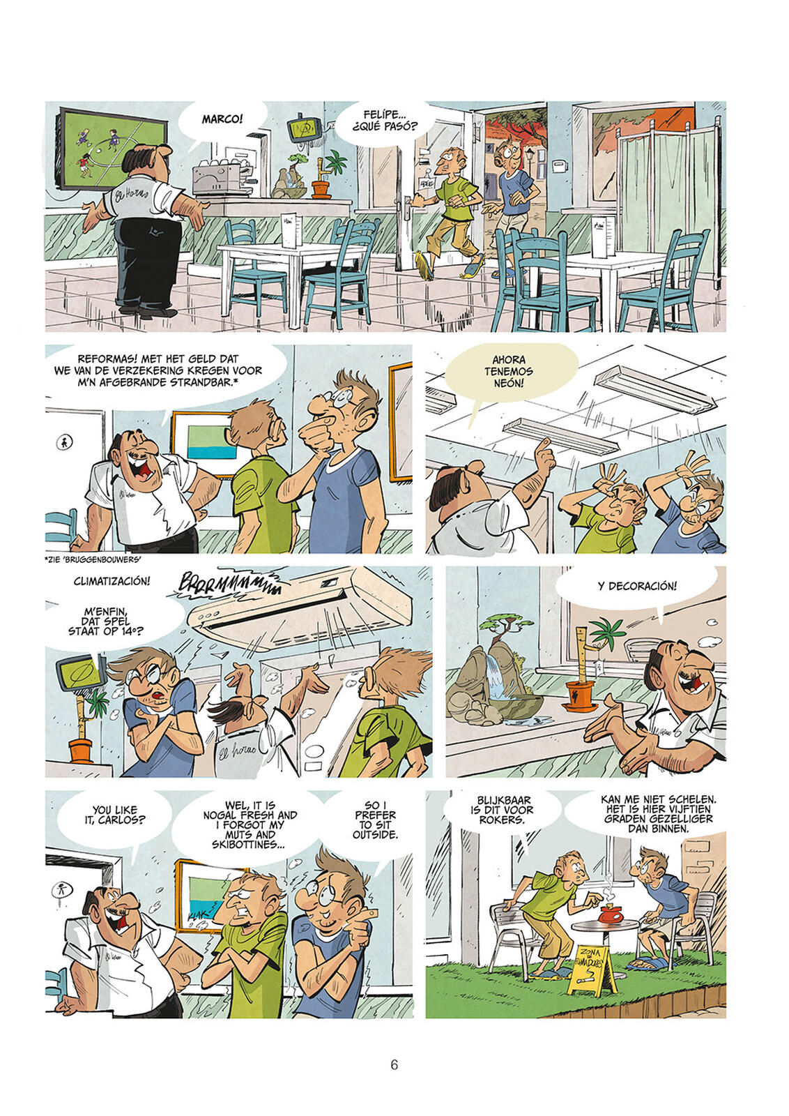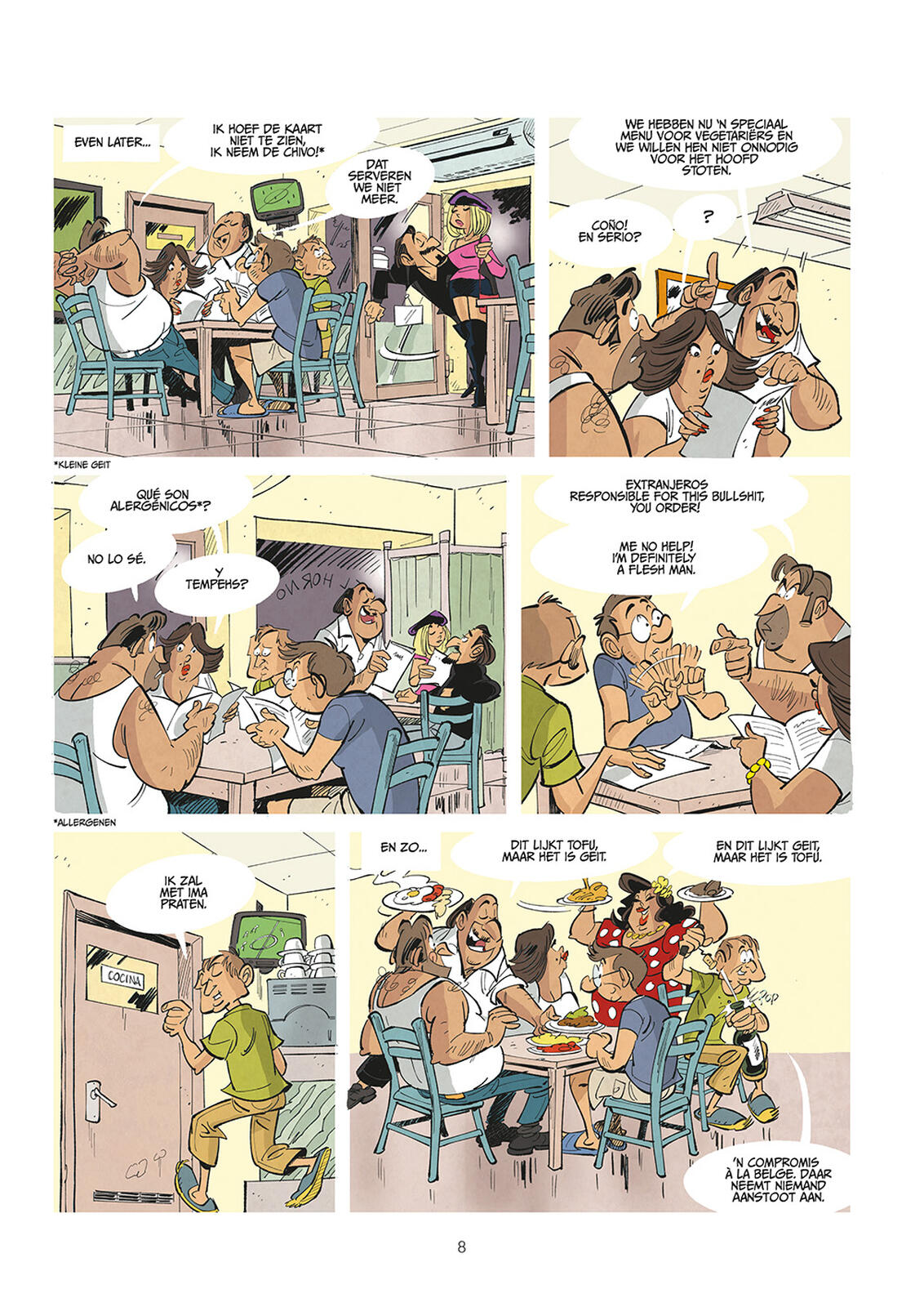 Het album biedt bovendien een charmante taalcocktail. Op ‘Jommekos’-wijze frissen we ons basis-Spaans op, terwijl de personages vlotjes overschakelen naar ‘Vlengels’ en zelfs ‘Vleutsch’. De internationale Vlaming pur sang. Zelfs enkele echt Vlaamse termen worden geduid voor de lezer.