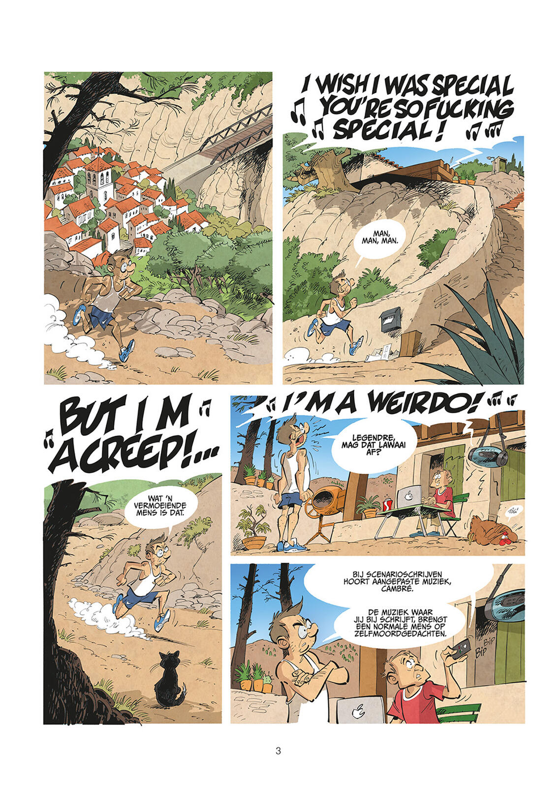 Zo krijgen het verval van de authentieke Spaanse sfeer en het lawaai van quads in de natuur een welgemikte sneer. Ook de stripwereld moet eraan geloven: een hilarische karikatuur van geitenwollen sokken, een schrijnend gebrek aan visie én centen… extravagante uitgevers... niets blijft gespaard. Daarnaast worden hedendaagse thema’s zoals overtoerisme en het vluchtelingenvraagstuk met een knipoog verwerkt, zonder belerend te worden.