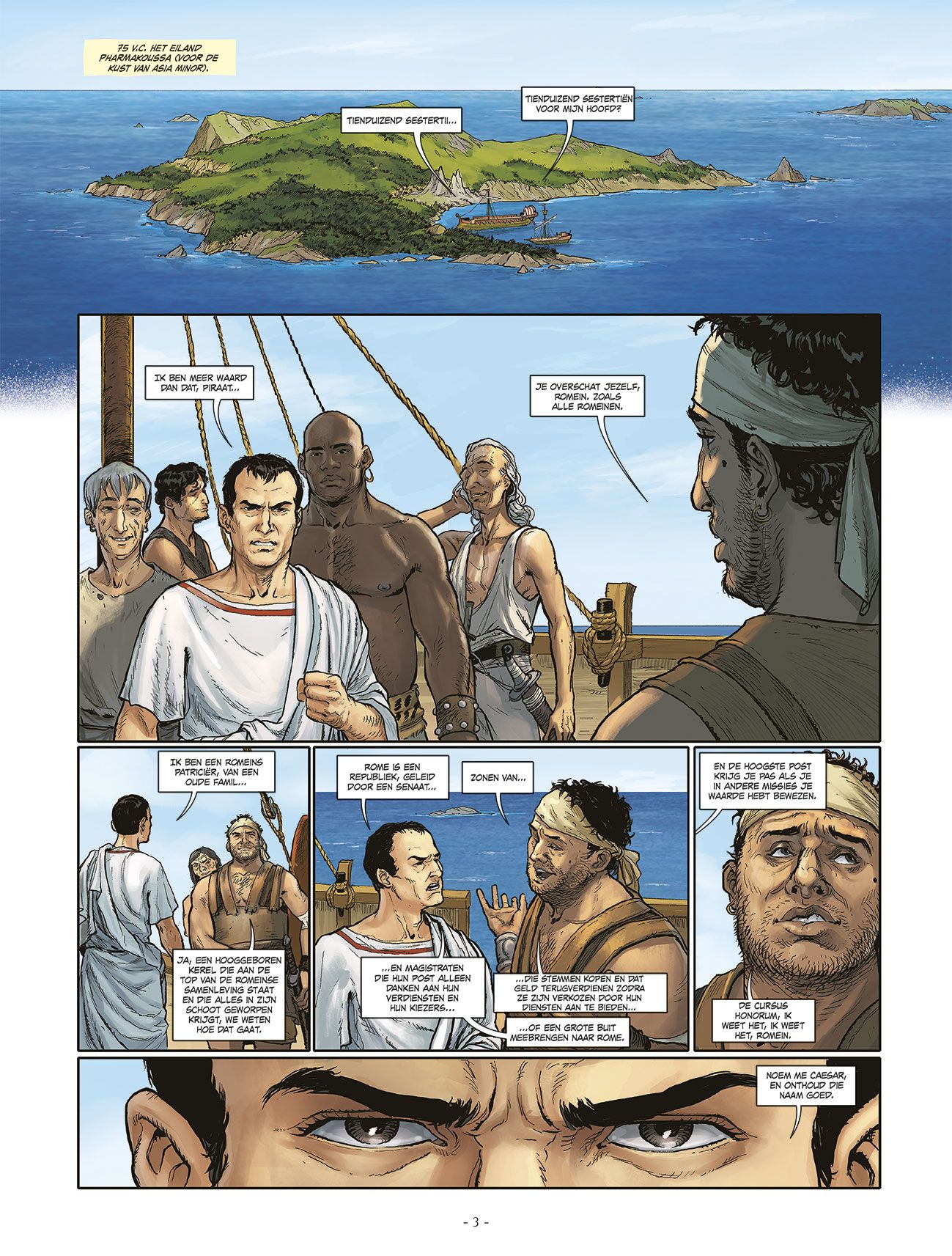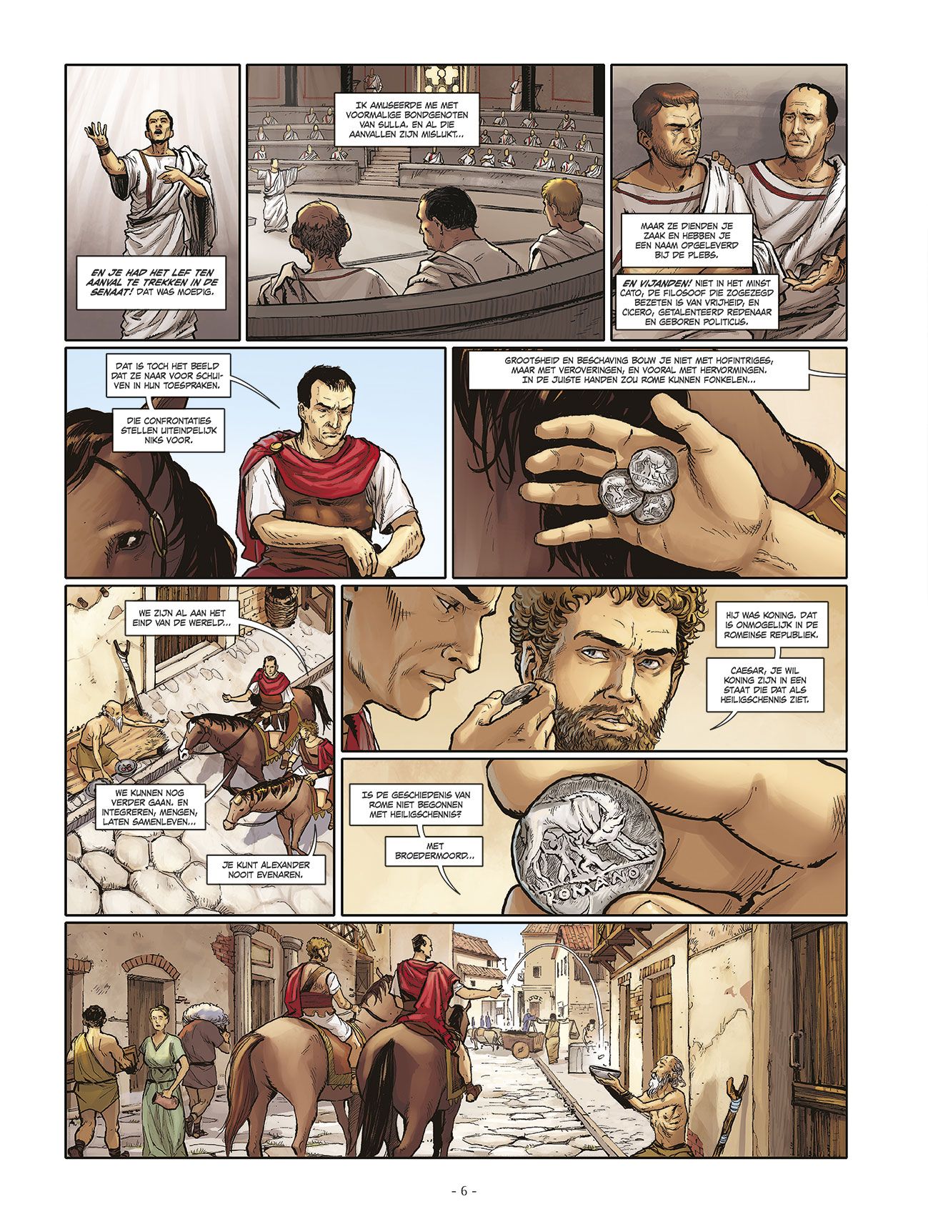 De man die letterlijk en figuurlijk geschiedenis schreef: Iulius Caesar • Een album over een van de grootste Romeinen, met een uitgebreid dossier, dat niet mocht ontbreken in deze collectie! • Mathieu Gabella vertelt op zijn manier over Caesar, de man, de generaal, de orator en schrijver… • Gelimiteerde hardcovereditie! De softcovereditie verschijnt in september Gabella Mathieu ( Frankrijk, °1976) is de stripscenarist van deze stripreeks en schreef ook mee aan volgende stripreeksen: 1. De Beul 2. De Eenhoorn 3. Drie Wensen 4. Zij schreven geschiedenis Meloni Andrea is vooral gekend als inkleurder van stripreeksen zoals Carthago maar hier een strip die hij helemaal zelf tekende ook Elisabeth uit de reeks Zij schreven geschiedenis is van zijn hand. Korte inhoud 75 v.C. Iulius Caesar, nauwelijks een jaar of twintig, begint aan zijn politieke carrière. Geïnspireerd door Alexander de Grote heeft hij een simpel doel: de macht grijpen in Rome en de stad de grootsheid bieden die ze verdient. Maar de weg is nog lang en Caesar weet dat je de macht evengoed verwerft binnen de stadsmuren als aan de grenzen van het rijk. Door zijn gulle uitgaven bij de spelen en door zijn zegerijke campagnes in Gallia krijgt hij de bevolking op zijn hand. Door handige politieke manoeuvres krijgt hij ook machtige politieke bondgenoten. Caesar is briljant en ambitieus en laat zich uiteindelijk tot dictator voor het leven uitroepen. Hij wordt het symbool van de almacht, van het militaire genie en politieke strategie. Iulius Caesar is de meest mythische Romeinse generaal en een van de meest iconische figuren uit de geschiedenis. Ontdek hoe de man een legende werd…