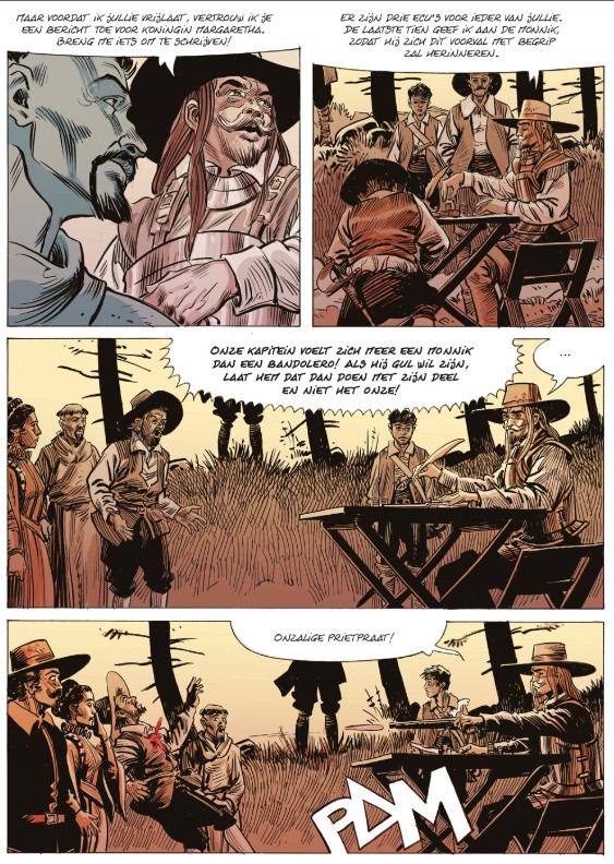Joan Mundet, die een grondige kennis van de geschiedenis combineert met een gevoel voor een soap die schatplichtig is aan een Jean-Michel Charlier, zet ons op het spoor van een vervloekte schat, achtervolgd door een groep personages die even vertederend als kleurrijk zijn.