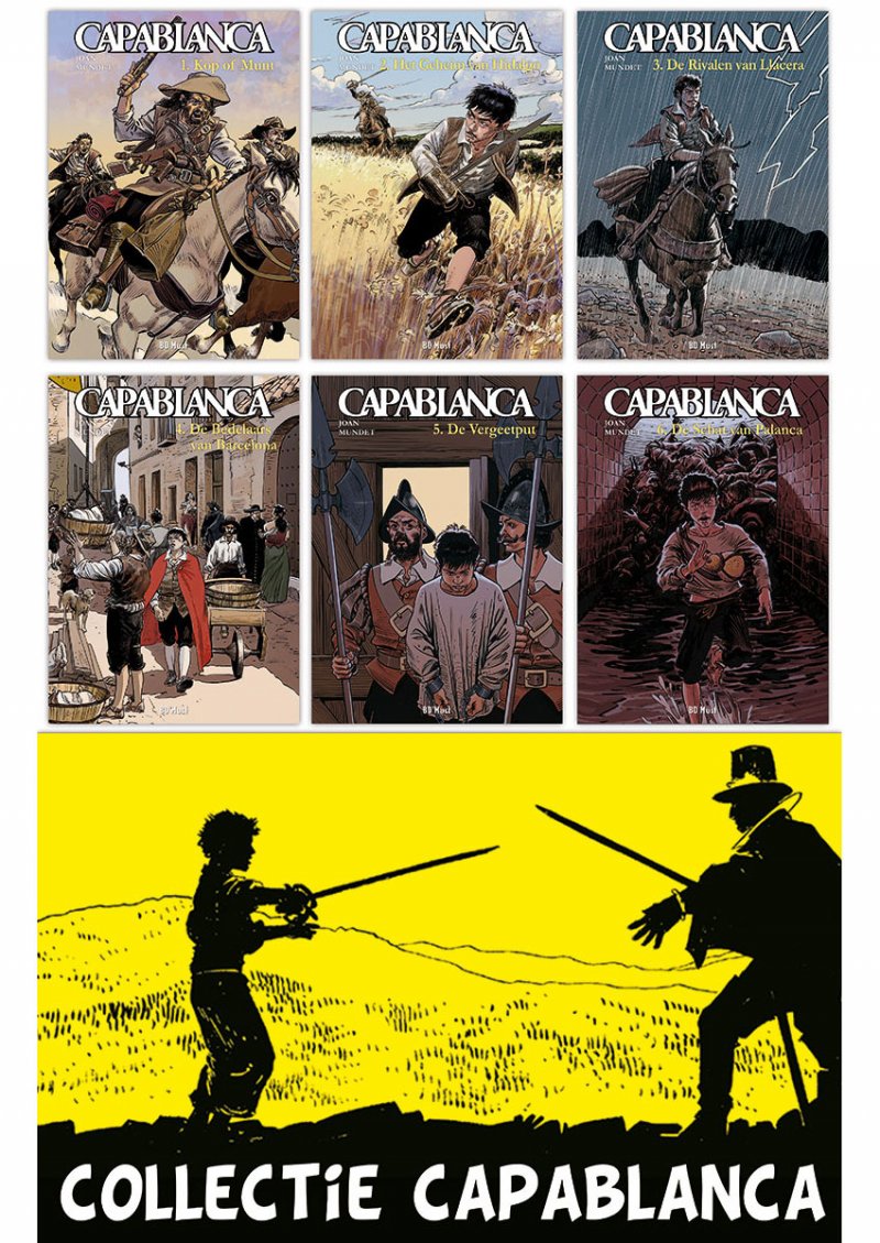 Collector pack met de volledige reeks van 6 delen in HC! In het zeventiende-eeuwse Catalonië, in een tijdperk waarin outlaws en rovers de plak zwaaien, veroorzaakt de dood van een vrouw een tragisch en complex onderzoek. De jonge Juan Muntada wordt de onvrijwillige hoofdrolspeler van dit verhaal. Om aan een gruwelijk lot te ontkomen, wordt hij een beroemde bandiet: Capablanca! Deze mantel- en degenstrip steunt op klassieke elementen uit Spaanse en Franse schelmenromans vol avontuur, bedrog en drama. In het zeventiende-eeuwse Catalonië, in een tijdperk waarin outlaws en rovers de plak zwaaien, veroorzaakt de dood van een vrouw een tragisch en complex onderzoek. De jonge Juan Muntada wordt de onvrijwillige hoofdrolspeler van dit verhaal. Om aan een gruwelijk lot te ontkomen, wordt hij een beroemde bandiet: Capablanca! Deze mantel- en degenstrip steunt op klassieke elementen uit Spaanse en Franse schelmenromans vol avontuur, bedrog en drama.