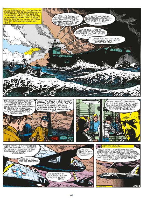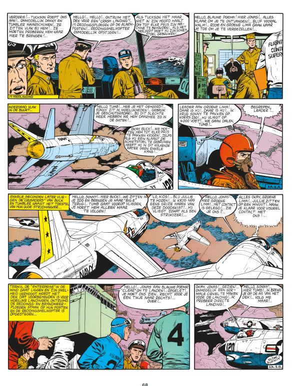Ook in deze integraal komen actuele kwesties aan bod. Vooral in het eerste tweeluik, dat een van de grootste zorgen van onze tijd behandelt: de gevaren van de atoombom. Het tweede tweeluik zoomt meer in op de psychologie van de personages en de technische hoogstandjes van de apparaten die Hubinon met zorgvuldig realisme tekent. We komen ook de angstaanjagende Lady X weer tegen, die we na wat plastische chirurgie amper nog herkennen. Zij probeert Buck Danny en zijn piloten, leden van de 'Blue Angels', in de weg te staan. Advertenties, covers en illustraties verfraaien deze integraal, die door Patrick Gaumer in een inleidend dossier wordt becommentarieerd. Integraal Publicatie: 2022, deel 10 van veertiendelige reeks die de periode van de tekenaars Victor Hubinon en Francis Bergèse ontsluit Uitgeverij: Dupuis Pagina's en uitvoering: 288, hardcover Dossier: 58 pagina's door Patrick Gaumer. Ruime en weelderig geïllustreerde aandacht voor de auteurs en hun andere activiteiten in de periode 1965-1970 waaronder de woelige periode van Mei '68 en veranderingen die dat teweegbrengen. Voor Jean-Michel Charlier wenken bijkomende uitdagingen bovenop zijn productie voor de stripweekbladen Robbedoes en Pilote: het schrijven van een tv-reeks van Tanguy en Laverdure. Intussen legt Victor Hubinon zich toe op kunstschilderen. Een staaltje van zijn kunnen is verzameld aan de hand van enkele voorbeelden. Van Buck Danny zijn posters uit Spirou, reclametekeningen, prentkaarten, aankondigingen en ander illustratiemateriaal bij elkaar gebracht.Het dossier vertelt verder over de evolutie van de stripreeks. Oorspronkelijke albumcovers: Zoals het hoort: paginagroot voor elk verhaal, inclusief de titelpagina's en oorspronkelijke backcovers. Compleet: Chronologische volgorde volgens de publicatie in Robbedoes en de albumreeks. Inclusief covers van het weekblad Robbedoes op verkleind formaat als illustratie bij het dossier. De drie korte verhalen achterin deze integrale horen tussen deel 36 en 37. Gebundelde verhalen* Deel 34: Atoomalarm (44 pagina's uit 1965-1966) Deel 35: Het Dodenescadrille (44 pagina's uit 1967) Deel 36: De Blauwe Engelen (44 pagina's uit 1969) Deel 37: De Piloot met het Leren Masker (47 pagina's uit 1970) Bijzondere Opdracht (2 pagina's uit 1969, opnieuw vertaald en geletterd in het album Buck Danny: Kortverhalen deel 1 uit 2020) Een Sterk Staaltje (2 pagina's uit 1969, opnieuw vertaald en geletterd in het album Buck Danny: Kortverhalen deel 1 uit 2020) Het Gebeurde in 38 (2 pagina's uit 1969, opnieuw vertaald en geletterd in het album Buck Danny: Kortverhalen deel 2 uit 2021) * De jaartallen zijn die van de eerste publicatie in Robbedoes. (bron ssz)