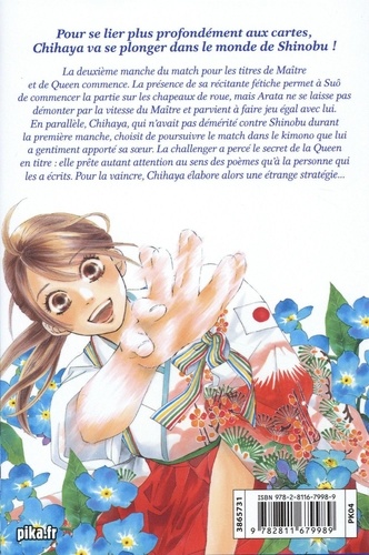 Pour se lier plus profondément aux cartes, Chihaya va se plonger dans le monde de Shinobu ! La deuxième manche du match pour les titres de Maître et de Queen commence. La présence de sa récitante fétiche permet à Suô de commencer la partie sur les chapeaux de roue, mais Arata ne se laisse pas démonter par la vitesse du Maître et parvient à faire jeu égal avec lui. En parallèle, Chihaya, qui n'avait pas démérité contre Shinobu durant la première manche, choisit de poursuivre le match dans le kimono que lui a gentiment apporté sa soeur. La challenger a percé le secret de la Queen en titre : elle prête autant attention au sens des poèmes qua la personne qui les a écrits. Pour la vaincre, Chihaya élabore alors une étrange stratégie...