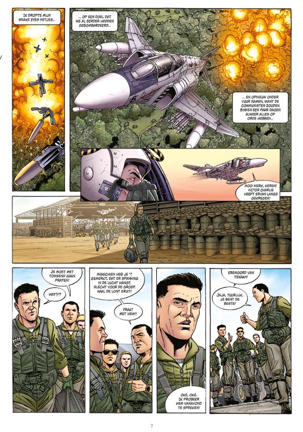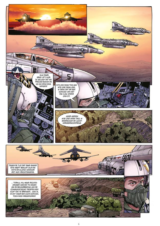 Bomb Road is een driedelige reeks van Michel Koeniguer Michael Koeniguer kennen we van ( Misty Mission, The Bridge, Berlijn wordt ons graf ). Over de pagina's keert de gepensioneerde kolonel terug naar de luchtoperaties die in zijn hoofd zijn gegrift. Op basis van een perfect gedocumenteerd scenario laat de auteur een deel van de psychologische ontwikkeling van de hoofdrolspelers achter om volledige aandacht te schenken aan de vliegmachines die dan ook belangrijk zijn in deze reeks. Als de plot slechts enkele verrassingen bevat, terwijl militair jargon sommige mensen die niet vertrouwd zijn met dit genre, kan ontmoedigen, zouden de vele actiescènes liefhebbers van oorlogsverhalen moeten verrassen. Tussen luchtaanvallen, napalmbommen, zware artillerie en bombardementen of verkenningsmissies heeft de lezer geen tijd om zich te vervelen. Met een zeer realistische stijl stelt Michel Koeniguer een nauwgezet werk voor op het vlak van luchtvaartscènes en aeronautica. De tekeningen van de vliegtuigen (F-4 Phantom) zijn prachtig en gedetailleerd maar de karakters lijken soms moeilijk van elkaar te onderscheiden. 1969. Elke avond worden de vele bodybags in de vliegtuigen geladen, voor een terugreis naar huis. Elke dag verwachten soldaten aan hun eind te komen in een vuurzee boven de dichte, stinkende jungle, zonder dat het ook maar ergens toe dient. Geen enkel redelijk mens wil leven op een zandstrook als Chu Lai, gekneld tussen de zee en de bergen...