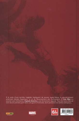 Lorsqu'un groupe de jeunes super-héros agit de façon inconsidérée et cause par accident des centaines de morts, les Etats-Unis réagissent en promulguant la Loi de Recensement des Surhumains. Iron Man décide de s'y soumettre mais Captain America y est fermement opposé. Ces héros deviennent les leaders de deux camps qui vont s'affronter, persuadés d'être chacun dans leur bon droit. L'issue de la bataille ne peut être que tragique... La meilleure vente des comics Marvel en France ! Un récit immanquable par deux auteurs ultra talentueux. On doit à Mark Millar Ultimates, Kick-Ass ou Kingsman et à Steve McNiven Old Man Logan, Nemesis ou La mort de Wolverine.