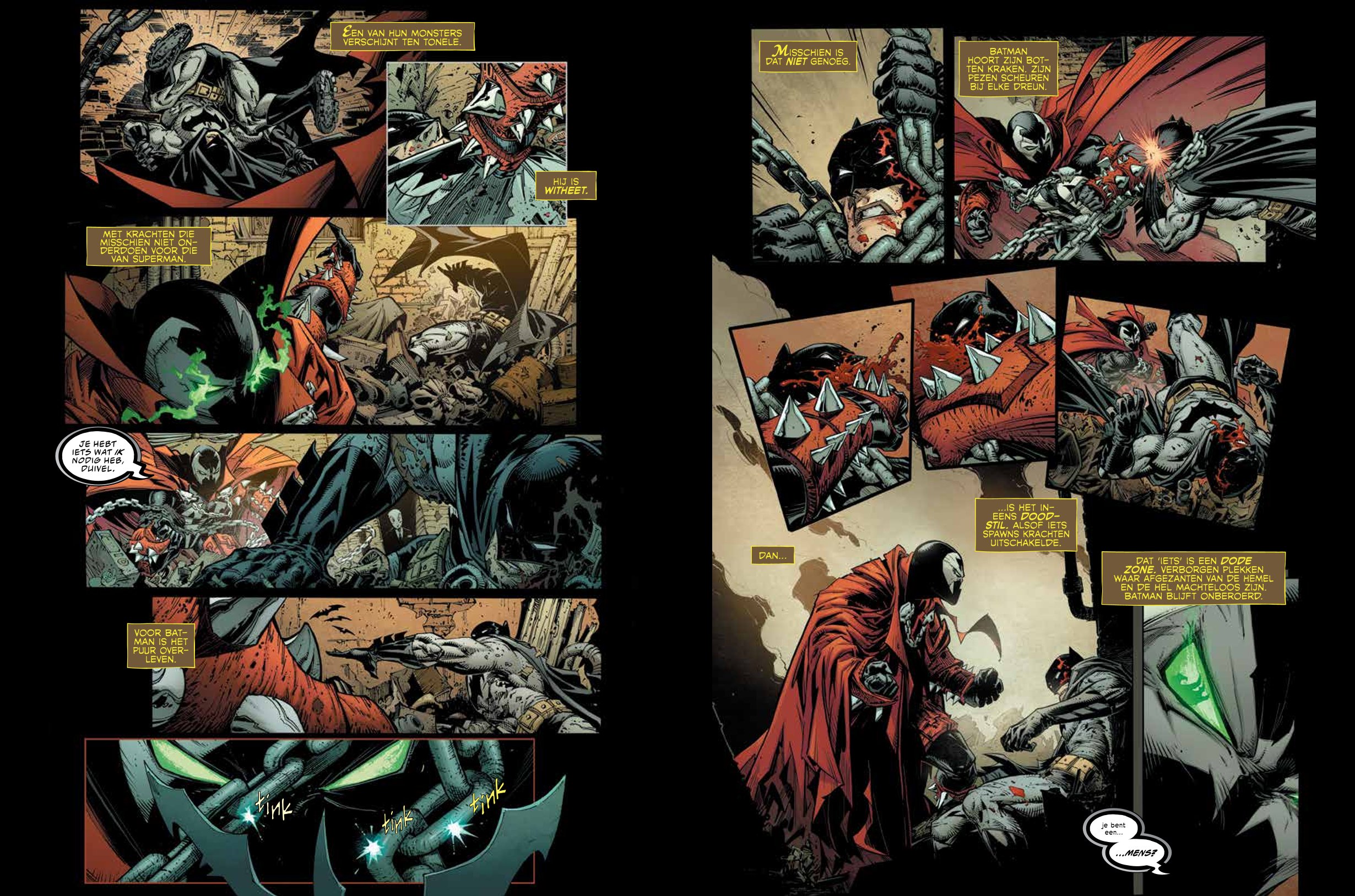 Laat ik deze laatste uitgave bespreken. Na vele jaren verschijnt er weer werk van Todd McFarlane in het Nederlands. Hij maakte in de jaren 1990 furore bij Marvels vlaggenschip, de reeks The Amazing Spider-Man. Hij creëerde onder andere het personage Venom en vertrok enkele jaren later om samen met enkele andere bekende artiesten hun eigen uitgeverij te beginnen. Dit resulteerde in het oprichten van Image Comics. Bijna dertig jaar later hebben ze nog steeds hun verdiende plek in de Amerikaanse comicsector. De huidige CEO is Marc Silvestri. Hij was samen met onder andere Jim Lee, Erik Laren, Rob Liefeld en Todd McFarlane een van de zeven oprichters van Image. Al vrij snel vertrok Jim Lee richting DC en Deadpool-bedenker Rob Liefeld begon aan een artistieke reis langs verschillende uitgeverijen. Met zijn eigen serie Spawn behaalde McFarlane het meest succes en enkele jaren later haalde hij Greg Capullo aan boord als nieuwe tekenaar, terwijl hij zelf voor de scenario’s instaat. Dit duo laat Spawn nu zijn pad kruisen met een andere iconische superheld. Batman en Spawn hebben ieder een donkere herinnering aan dezelfde dag en ze gaan er anders mee om. Hun gezamenlijke tegenstander is het Hof der Uilen.