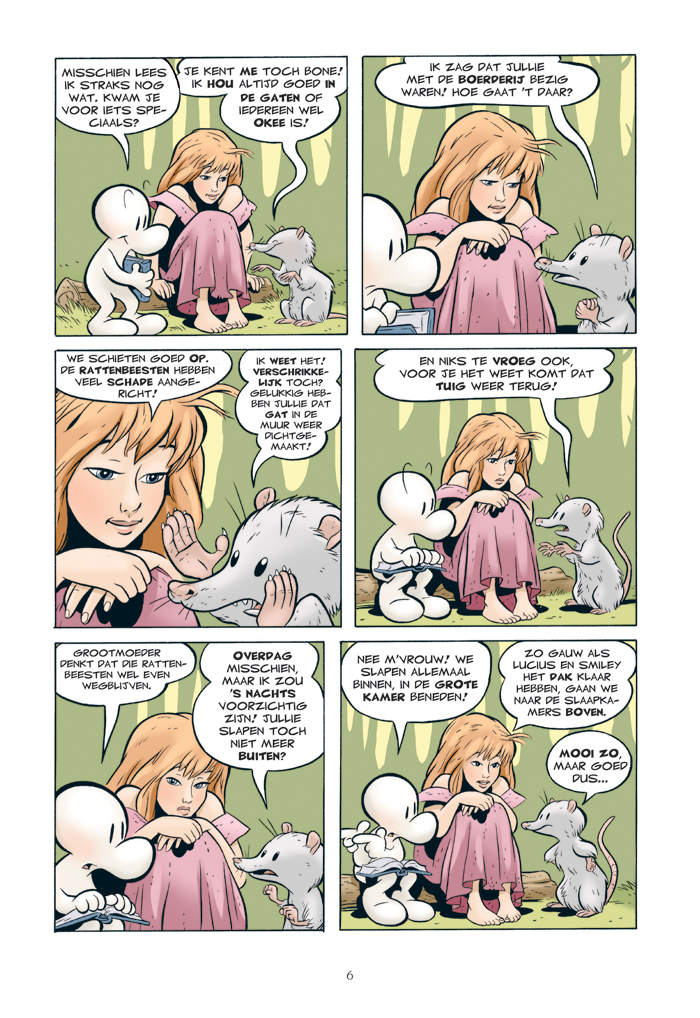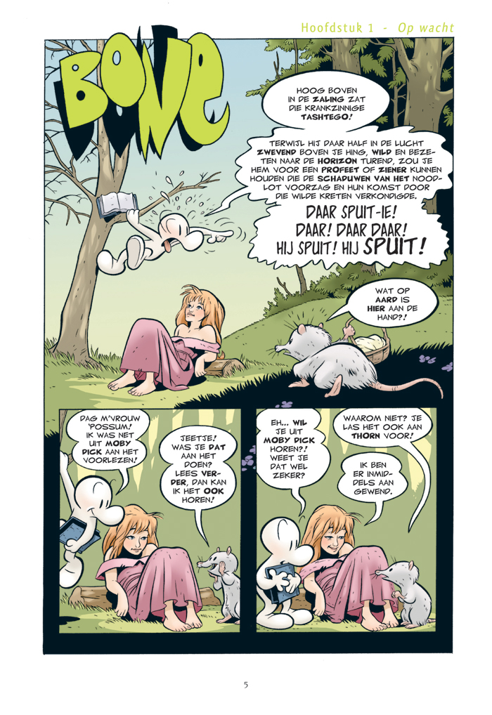Bone is een van de grootste stripgeschiedenissen van het afgelopen decennium. Het is een verbluffende mengeling van fantasy, humor en avontuur. Het is iets tussen Tolkien en Donald Duck. Al meer dan twee miljoen lezers maakten kennis met de drie neven Phoney, Smiley en Fone Bone die nadat ze uit hun stad zijn verjaagd in een wonderlijke, soms idyllische vallei terechtkomen., die wordt bewoond door mensen en uiteenlopende wezens als draken, rattenbeesten en enorme wandelende takken. De vallei wordt bedreigd en de Bone-neven spelen tegen wil en dank een rol bij de redding ervan. De serie omvat negen delen, in totaal iets meer dan 1300 pagina's. 'Net zo meeslepend als In de ban van de ring,' schreef Time Magazine, 'maar grappiger.' Jeff Smith begon in 1991, nadat hij bij verschillende studio's had getekend, aan de Bone-saga. Destijds was niemand geïnteresseerd en hij bracht de eerste delen in eigen beheer in zwart-wit uit. Inmiddels zijn er miljoenen Bones verkocht. De serie is veelvuldig onderscheiden. In de Verenigde Staten kreeg Bone de belangrijkste stripprijzen: tien Eisner Awards en elf Harvey Awards. De inkleuring, ook onderscheiden, is van Steve Hamaker.