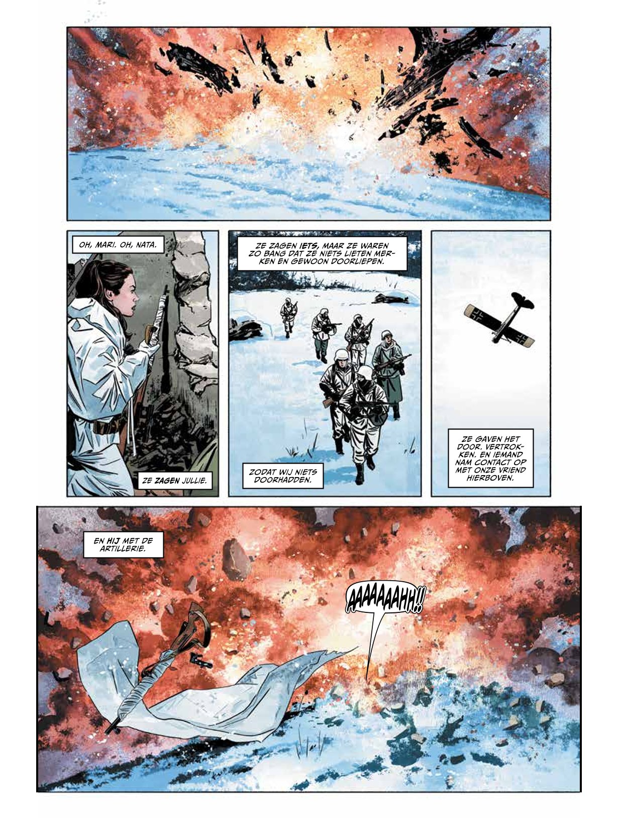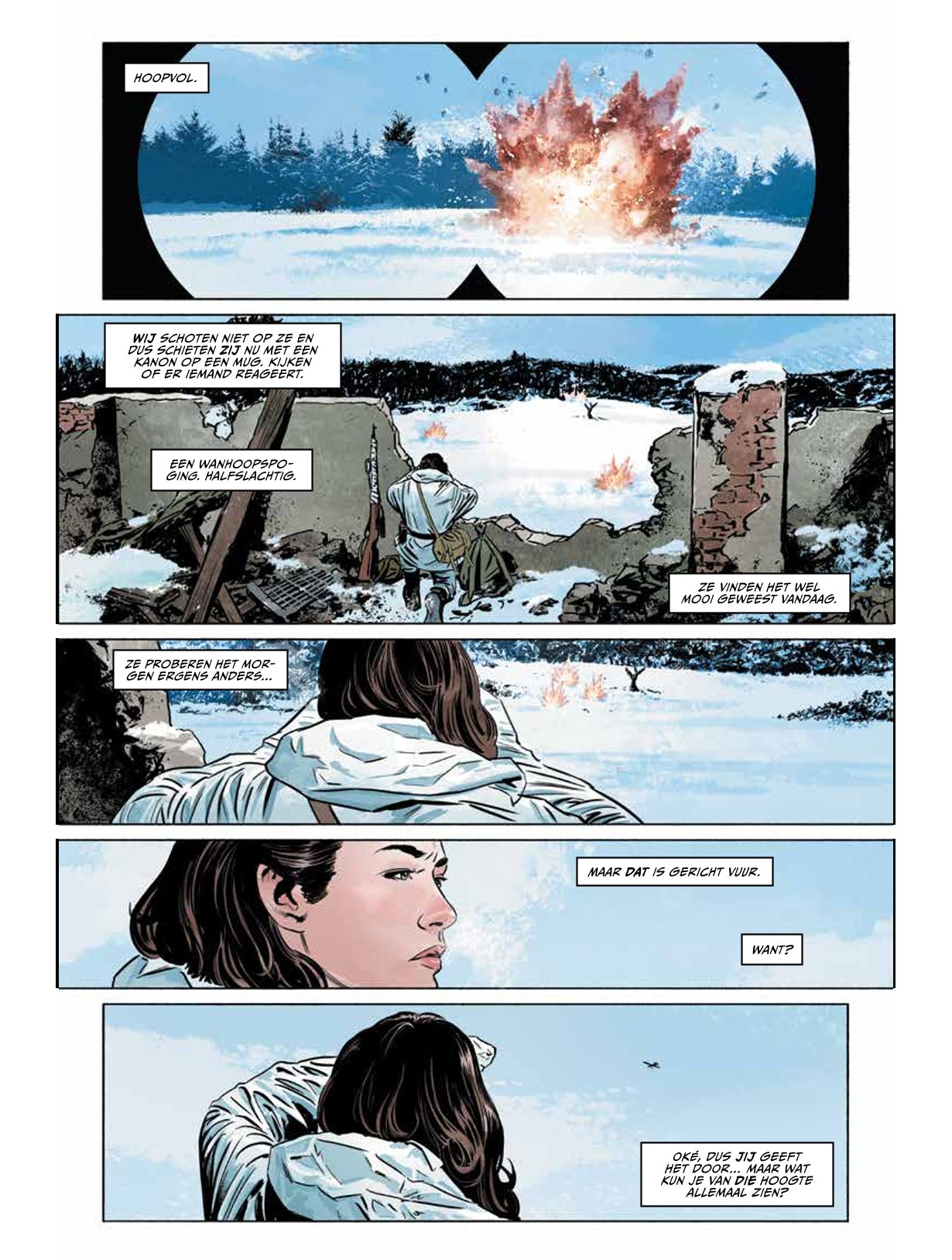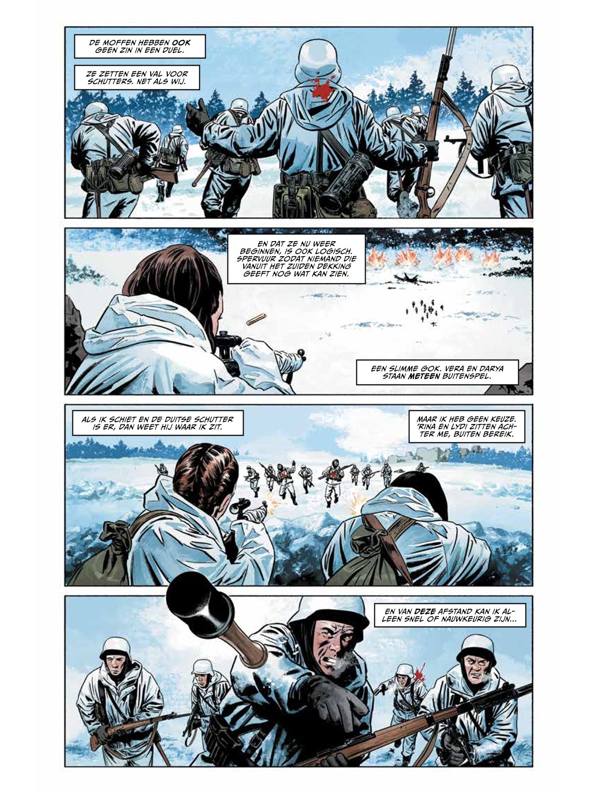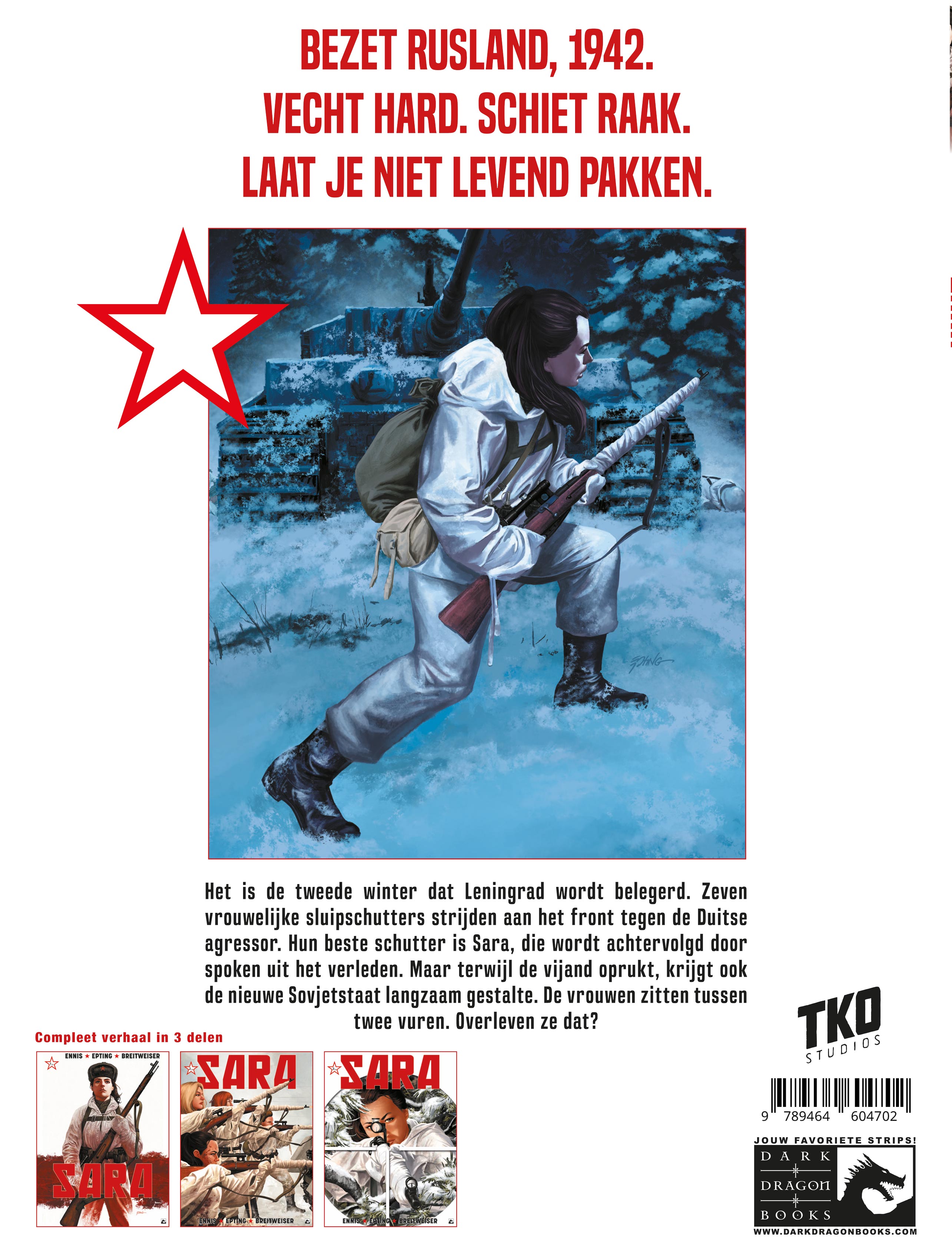 BEZET RUSLAND, 1942. VECHT HARD. SCHIET RAAK. LAAT JE NIET LEVEND PAKKEN. Het is de tweede winter dat Leningrad wordt belegerd. Zeven vrouwelijke sluipschutters strijden aan het front tegen de Duitse agressor. Hun beste schutter is Sara, die wordt achtervolgd door spoken uit het verleden. Maar terwijl de vijand oprukt, krijgt ook de nieuwe Sovjetstaat langzaam gestalte. De vrouwen zitten tussen twee vuren. Overleven ze dat? Sara Tekst: Garth Ennis Tekeningen: Steve Epting ISBN 3/3. 9789464604702 Softcover 56 blz. incl. dossier