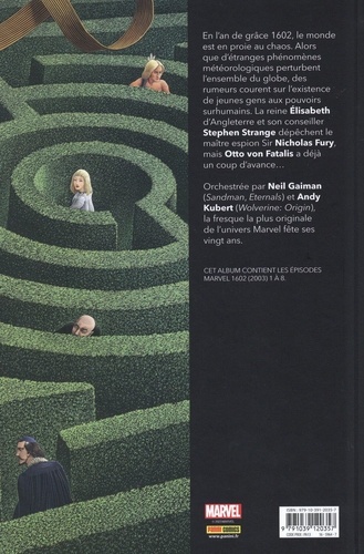 En l'an de grâce 1602, le monde est en proie au chaos. Alors que d'étranges phénomènes météorologiques perturbent l'ensemble du globe, des rumeurs courent sur l'existence de jeunes gens aux pouvoirs surhumains. La reine Elisabeth d'Angleterre et son conseiller Stephen Strange dépêchent le maître espion Sir Nicholas Fury, mais Otto von Fatalis a déjà un coup d'avance... Orchestrée par Neil Gaiman (Sandman, Eternals) et Andy Kubert (Wolverine : Origin), la fresque la plus originale de l'univers Marvel fête ses vingt ans.