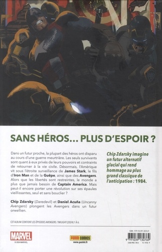 Sans héros... plus d'espoir ? Dans un futur proche, la plupart des héros ont disparu au cours d'une guerre meurtrière. Les seuls survivants sont quant eux privés de leurs pouvoirs et contraints de retourner à la vie civile. Désormais, l'Amérique vit sous l'étroite surveillance de James Stark, le fils d'Iron Man et de la Guêpe, ainsi que des Avengers. Alors que les libertés sont restreintes, le monde a plus que jamais besoin de Captain America. Mais peut-il encore porter une révolution sur ses épaules vieillissantes, seul et sans bouclier ? Chip Zdarsky (Daredevil) et Daniel Acuna (Uncanny Avengers) plongent les Avengers dans un futur orwellien. Chip Zdarsky imagine un futur alternatif glacial qui rend hommage au plus grand classique de l'anticipation : 1984.