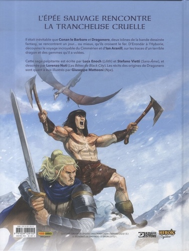Le choc de l'acier contre l'acier va produire des étincelles ! C'est le moment tant attendu de la rencontre entre l'épée sauvage de Conan et celle de Dragonero. Découvrez l'incroyable voyage de Ian Aranill et Conan à Erondár, puis sur le continent hyborien à la poursuite d'un terrible dragon et des gemmes qu'il a volées... Une course contre la montre pour récupérer les joyaux mystiques avant qu'un puissant démon ne se réveille et ne détruise Tarantia et tout le royaume d'Aquilonia ! Dragonero est une bande dessinée italienne de fantasy créée en 2007 par Luca Enoch et Stefano Vietti et qui connaît depuis un gros succès. Jeu de rôle, romans, spin offs... La série se décline et cartonne année après année (à l'instar d'un Lanfeust en France). Les deux créateurs du personnage de Ian Aranil, surnommé Dragonero, ont ici l'occasion de le présenter à Conan le Barbare dans un récit exceptionnel. Pour profiter au mieux des magnifiques dessins du florentin Lorenzo Nuti, Panini Comics propose également une édition collector limitée en noir & blanc.