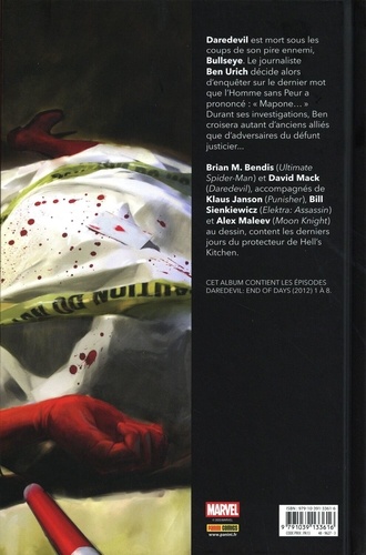 Des années après avoir disparu, Daredevil refait surface, mais il est aussitôt abattu par l'un de ses plus terribles adversaires. En entendant ses dernières paroles, le journaliste Ben Urich décide de dénicher un dernier scoop : où était passé Matt Murdock et qu'est-ce qui a provoqué son retour ? Brian Michael Bendis, auteur d'un run mémorable de Daredevil dans lequel l'identité secrète du héros était dévoilée, raconte l'ultime aventure de Matt Murdock aux côtés d'artistes prestigieux durablement associés à l'univers de l'Homme Sans Peur. Une saga épique et incontournable.