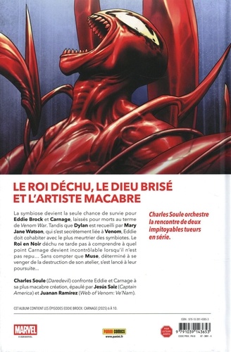 La symbiose devient la seule chance de survie pour Eddie Brock et Carnage, laissés pour morts au terme de Venom War. Tandis que Dylan est recueilli par Mary Jane Watson, qui s'est secrètement liée à Venom, Eddie doit cohabiter avec le plus meurtrier des symbiotes. Le Roi en Noir déchu ne tarde pas à comprendre à quel point Carnage devient incontrôlable lorsqu'il n'est pas repu... Sans compter que Muse, déterminé à se venger de la destruction de son atelier, s'est lancé à leur poursuite... Charles Soule (Daredevil) confronte Eddie et Carnage à sa plus macabre création, épaulé par Jesús Saiz (Captain America) et Juanan Ramírez (Web of Venom : Vé Nam).