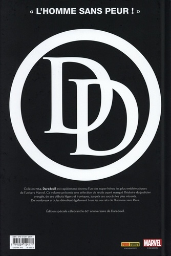 En voulant sauver quelqu'un qui s'apprête à être renversé par un camion, le jeune Matt Murdock est exposé à des produits chimiques, qui le rendent aveugle mais décuplent ses autres sens. Pétri d'un sens aigu de la justice, Matt devient avocat. Mais quand les lois sont bafouées, quand le droit est transgressé, il change de costume et devient alors Daredevil, l'Homme Sans Peur ! Pour les 60 ans de Daredevil, nous proposons une nouvelle édition de l'anthologie retraçant sa carrière, agrémentée de nouveaux épisodes parus depuis sa dernière réédition. Peu de héros ont vu autant de stars des comics défiler pour écrire et dessiner leurs aventures, chaque épisode de cet album est donc un incontournable !