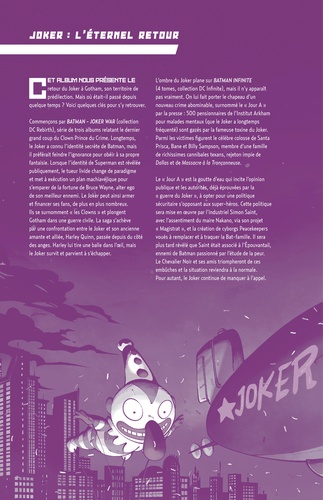 Quand le chat n'est pas là, les souris dansent... L'absence du Joker à Gotham a laissé le terrain libre à ses plus fidèles rivaux, qui n'ont pas tardé à se partager le pouvoir sur les bas-fonds de la ville. Double-face, le Pingouin, le Sphinx ou encore Black Mask, aucun n'était préparé au retour du Prince Clown du Crime, et encore moins à sa vendetta. S'il ne peut pas reprendre Gotham, il prendra le contrôle des Etats-Unis !