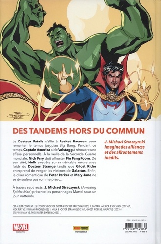 Le Docteur Fatalis s'allie à Rocket Raccoon pour remonter le temps jusqu'au Big Bang. Pendant ce temps, Captain America aide Volstagg à résoudre une affaire personnelle. A la veille de la Seconde Guerre mondiale, Nick Fury doit affronter Fin Fang Foom. De son côté, Hulk enquête sur sa véritable nature avec l'aide du Docteur Strange tandis que Ghost Rider entreprend de venger les victimes de Galactus. Enfin, le dîner romantique de Peter Parker et Mary Jane ne se déroulera pas comme prévu... J. Michael Straczynski A travers sept récits, J. Michael Straczynski (Amazing Spider-Man) présente les personnages Marvel sous un jour inattendu. imagine des alliances et des affrontements inédits.