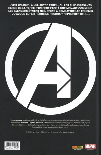 Il y a soixante ans, les plus puissants héros de la Terre s'unirent pour affronter les menaces qu'aucun héros seul n'est capable de repousser. Depuis, les Avengers font régner la justice face aux super-vilains les plus redoutables de l'univers Marvel, et l'équipe a eu bien des visages. En l'honneur des 60 ans de l'équipe fondée par Thor, Iron Man, Hulk, Ant-Man et la Guêpe, nous vous proposons une nouvelle édition de cette anthologie retraçant la carrière des célèbres héros. Un riche contenu éditorial et des épisodes empruntés à diverses périodes sont au programme.