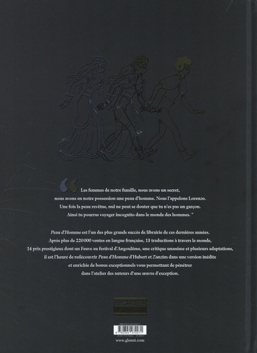 "Les femmes de notre famille, nous avons un secret, nous avons en notre possession une peau d'homme. Nous l'appelons Lorenzo. Une fois la peau revêtue, nul ne peut se douter que tu n'es pas un garçon. Ainsi tu pourras voyager incognito dans le monde des hommes." Peau d'Homme est l'un des plus grands succès de librairie de ces dernières années. Après plus de 220 000 ventes en langue française, 13 traductions à travers le monde, 14 prix prestigieux dont un Fauve au festival d'Angoulême, une critique unanime et plusieurs adaptations, il est l'heure de redécouvrir Peau d'Homme d'Hubert et Zonzim dans une version inédite et enrichie de bonus exceptionnels vous permettant de pénétrer dans l'atelier des auteurs d'une oeuvre d'exception.